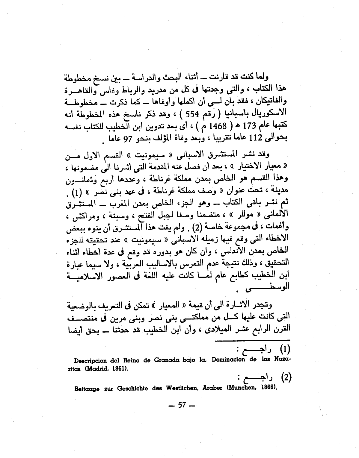 ثم نشر باقى الكتاب- وهو الجزء الخاص بمدن المغرب- المستشرق الالمانى «موللر» ، متضمنا وصفا لجبل الفتح، وسبتة، ومراكش، وأغمات، فى مجموعة خاصة «2» . ولم يفت هذا المستشرق أن ينوه ببعض الاخطاء التى وقع فيها زميله الاسبانى «سيمونيت» عند تحقيقه للجزء الخاص بمدن الاندلس، وان كان هو بدوره قد وقع فى عدة أخطاء أثناء التحقيق، وذلك نتيجة عدم التمرس بالاساليب العربية، ولا سيما عبارة ابن الخطيب كطابع عام لما كانت عليه اللغة فى العصور الاسلامية الوسطى.