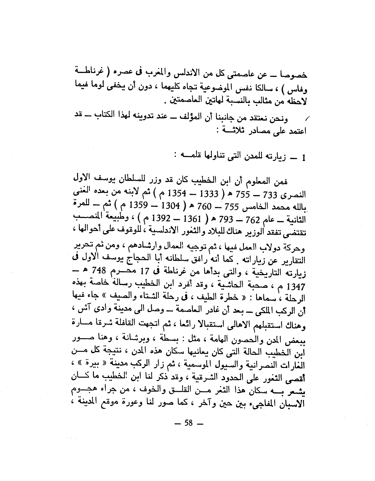 خصوصا- عن عاصمتى كل من الاندلس والمغرب فى عصره (غرناطة وفاس) ، سالكا نفس الموضوعية تجاه كليهما، دون أن يخفى لوما فيما لاحظه من مثالب بالنسبة لهاتين العاصمتين.