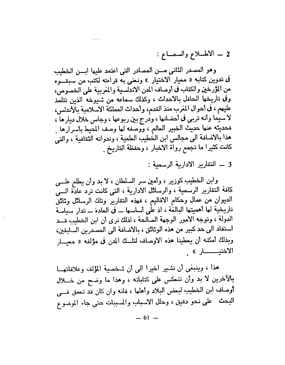 وهو المصدر الثانى من المصادر التى اعتمد عليها ابن الخطيب فى تدوين كتابه «معيار الاختيار» ونعنى به قراءته لكتب من سبقوه من المؤرخين والكتاب فى أوصاف المدن الاندلسية والمغربية على الخصوص، وفى تاريخها الحافل بالاحداث، وكذلك سماعه من شيوخه الذين تتلمذ عليهم، فى أحوال المغرب منذ القدم، وأحداث المملكة الاسلامية بالأندلس، لا سيما وأنه تربى فى أحضانها، ودرج بين ربوعها، وجاس خلال ديارها، فحديثه عنها حديث الخبير العالم، ووصفه لها وصف المحيط بأسرارها.