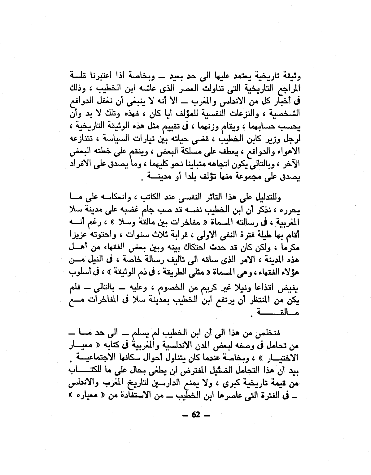 فنخلص من هذا الى أن ابن الخطيب لم يسلم- الى حد ما- من تحامل فى وصفه لبعض المدن الاندلسية والمغربية فى كتابه «معيار الاختيار» ، وبخاصة عندما كان يتناول أحوال سكانها الاجتماعية.