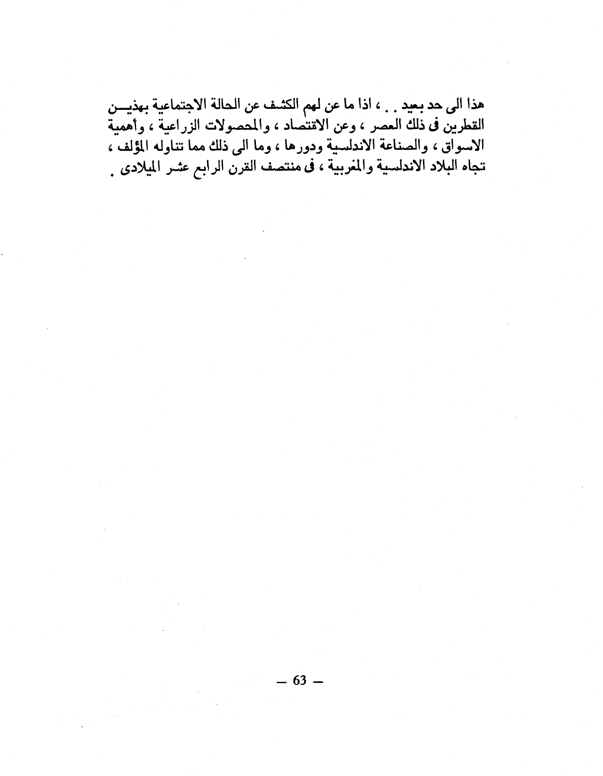 هذا الى حد بعيد..، اذا ما عن لهم الكشف عن الحالة الاجتماعية بهذين القطرين فى ذلك العصر، وعن الاقتصاد، والمحصولات الزراعية، وأهمية الاسواق، والصناعة الاندلسية ودورها، وما الى ذلك مما تناوله المؤلف، تجاه البلاد الاندلسية والمغربية، فى منتصف القرن الرابع عشر الميلادى.