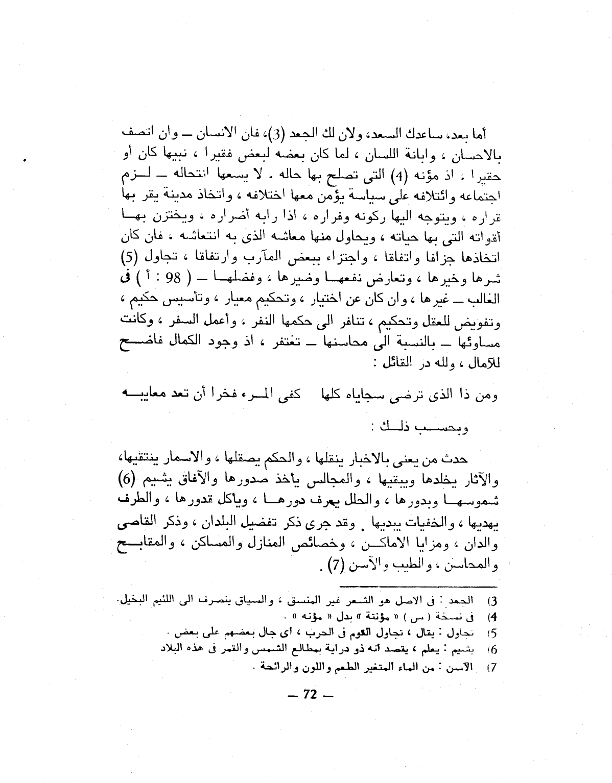 أما بعد، ساعدك السعد، ولان لك الجعد «3» ، فان الانسان- وان انصف بالاحسان، وابانة اللسان، لما كان بعضه لبعض فقيرا، نبيها كان أو حقيرا. اذ مؤنه «4» التى تصلح بها حاله. لا يسعها انتحاله- لزم اجتماعه وائتلافه على سياسة يؤمن معها اختلافه، واتخاذ مدينة يقر بها قراره، ويتوجه اليها ركونه وفراره، اذا رابه أضراره، ويختزن بها أقواته التى بها حياته، ويحاول منها معاشه الذي به انتعاشه، فان كان اتخاذها جزافا واتفاقا، واجتزاء ببعض المآرب وارتفاقا، تجاول «5» شرها وخيرها، وتعارض نفعها وضيرها، وفضلها- (98: أ) فى الغالب- غيرها، وان كان عن اختيار، وتحكيم معيار، وتأسيس حكيم، وتفويض للعقل وتحكيم، تنافر الى حكمها النفر، وأعمل السفر، وكانت مساوئها- بالنسبة الى محاسنها- تغتفر، اذ وجود الكمال فاضح للآمال، ولله در القائل: