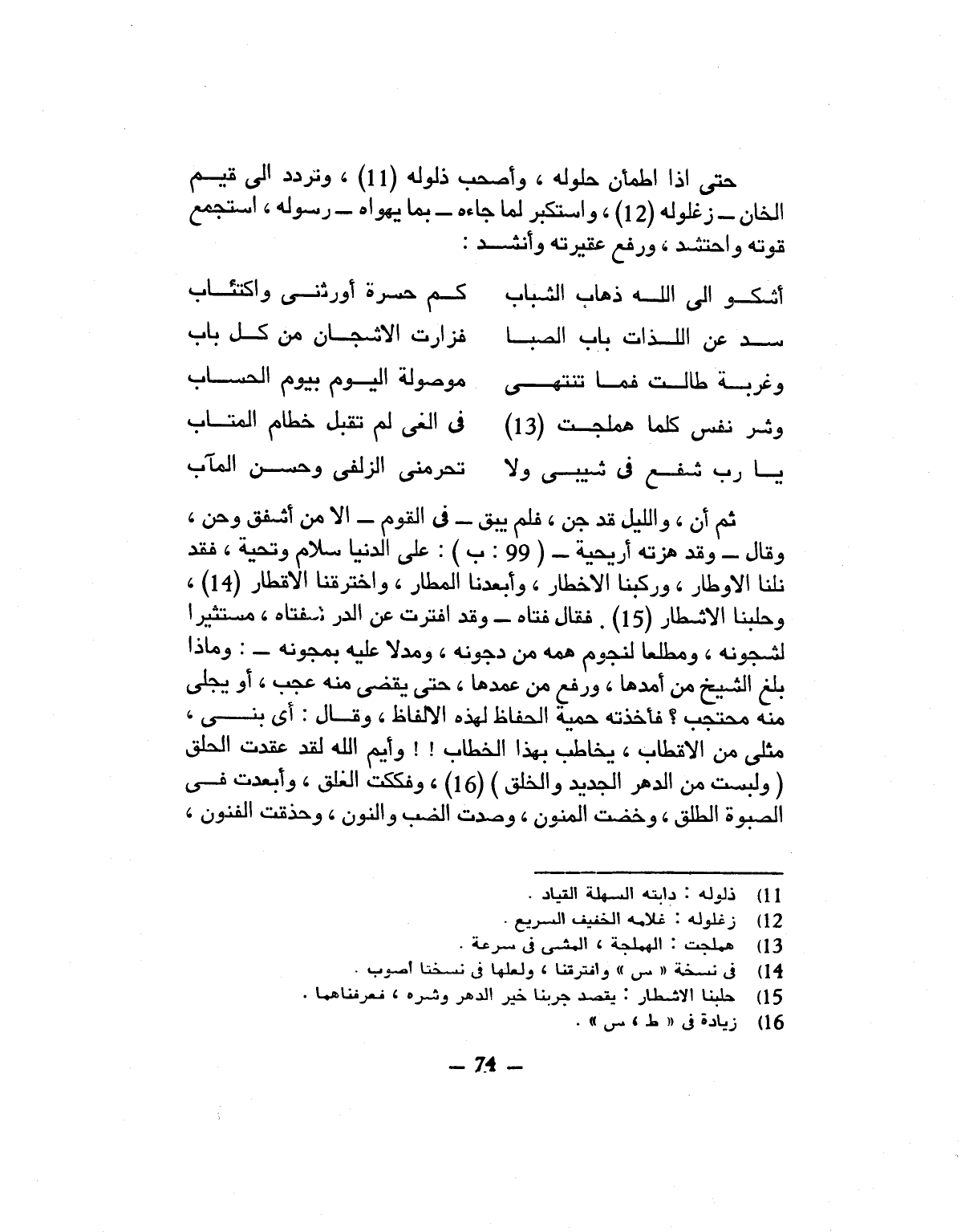 ثم أن، والليل قد جن، فلم يبق- فى القوم- الا من أشفق وحن، وقال- وقد هزته أريحية- (99: ب) : على الدنيا سلام وتحية، فقد نلنا الاوطار، وركبنا الاخطار، وأبعدنا المطار، واخترقنا الاقطار «14» ، وحلبنا الاشطار «15» . فقال فتاه- وقد افترت عن الدر شفتاه، مستثيرا لشجونه، ومطلعا لنجوم همه من دجونه، ومدلا عليه بمجونه-:وماذا بلغ الشيخ من أمدها، ورفع من عمدها، حتى يقضى منه عجب، أو يجلى منه محتجب؟ فأخذته حمية الحفاظ لهذه الالفاظ، وقال: أى بنى، مثلى من الاقطاب، يخاطب بهذا الخطاب!! وأيم الله لقد عقدت الحلق (ولبست من الدهر الجديد والخلق) «16» ، وفككت الغلق، وأبعدت فى الصبوة الطلق، وخضت المنون، وصدت الضب والنون، وحذقت الفنون،
