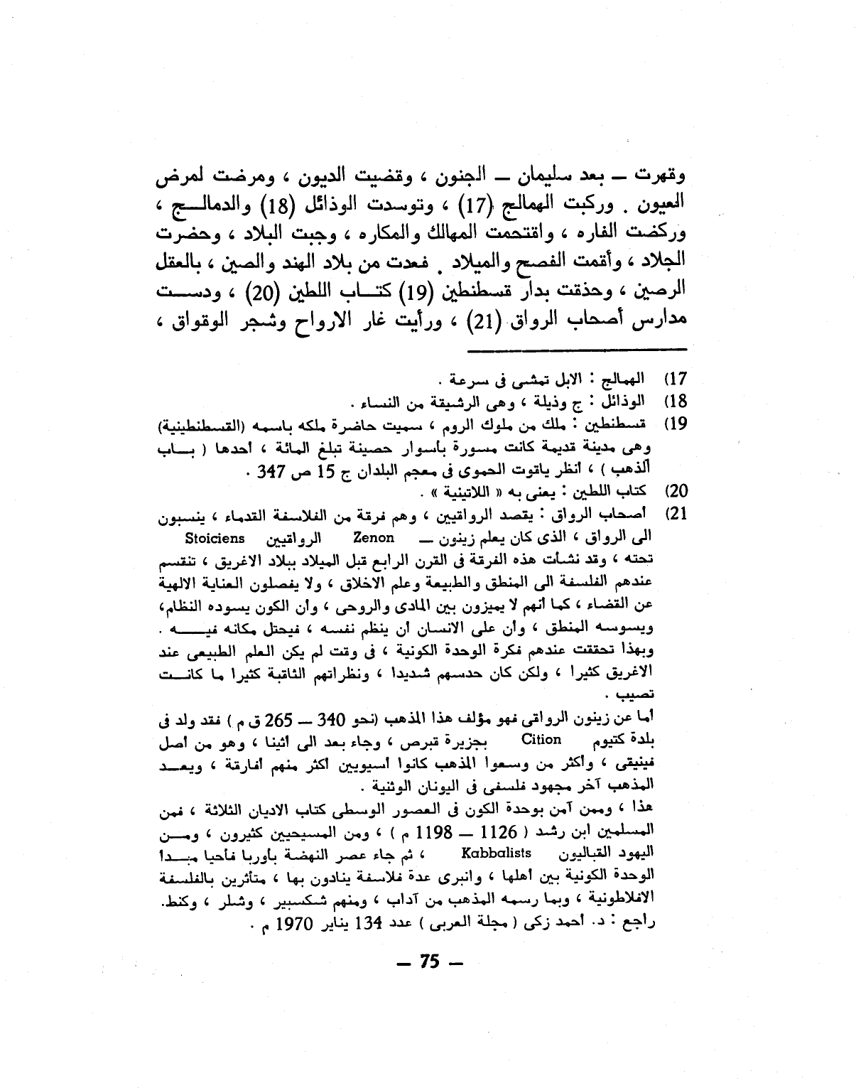 وقهرت- بعد سليمان- الجنون، وقضيت الديون، ومرضت لمرض العيون. وركبت الهمالج «17» ، وتوسدت الوذائل «18» والدمالج، وركضت الفاره، واقتحمت المهالك والمكاره، وجبت البلاد، وحضرت الجلاد، وأقمت الفصح والميلاد. فعدت من بلاد الهند والصين، بالعقل الرصين، وحذقت بدار قسطنطين «19» كتاب اللطين «20» ، ودست مدارس أصحاب الرواق «21» ، ورأيت غار الارواح وشجر الوقواق،