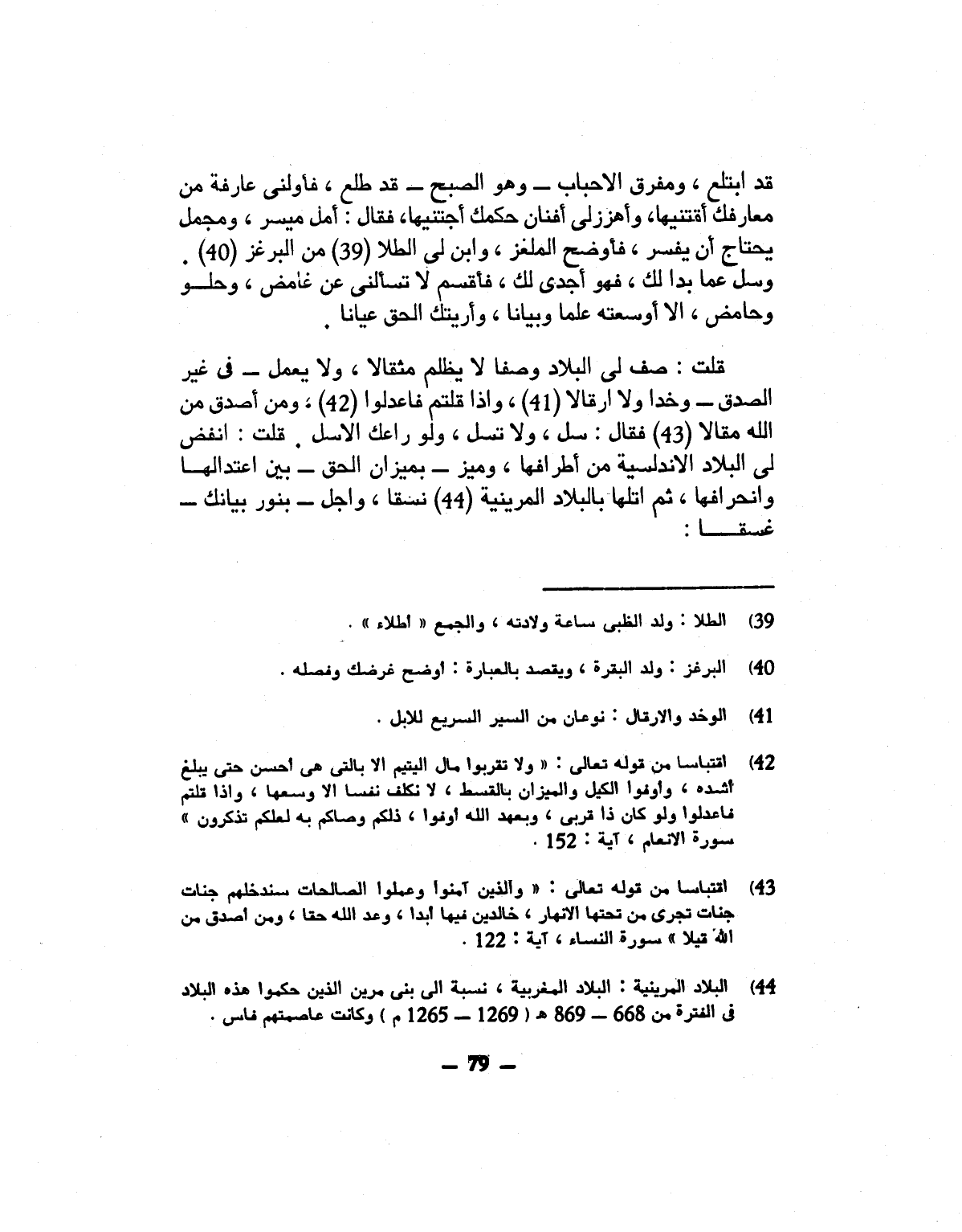 قلت: صف لى البلاد وصفا لا يظلم مثقالا، ولا يعمل- فى غير الصدق- وخدا ولا ارقالا «41» ، واذا قلتم فاعدلوا «42» ، ومن أصدق من الله مقالا «43» فقال: سل، ولا تسل، ولو راعك الاسل. قلت: انفض لى البلاد الاندلسية من أطرافها، وميز- بميزان الحق- بين اعتدالها وانحرافها، ثم اتلها بالبلاد المرينية «44» نسقا، واجل- بنور بيانك- غسقا: