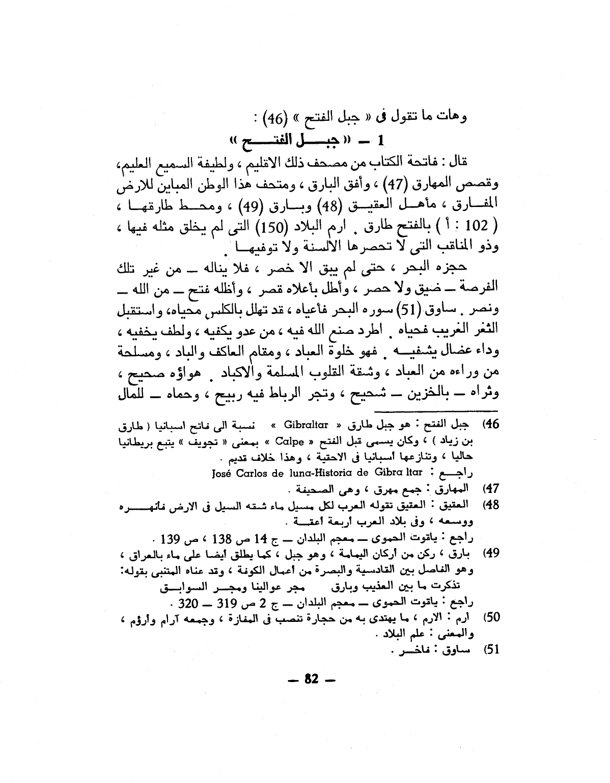 قال: فاتحة الكتاب من مصحف ذلك الاقليم، ولطيفة السميع العليم، وقصص المهارق «47» ، وأفق البارق، ومتحف هذا الوطن المباين للارض المفارق، مأهل العقيق «48» وبارق «49» ، ومحط طارقها، (102: أ) بالفتح طارق. ارم البلاد «50» التى لم يخلق مثله فيها، وذو المناقب التى لا تحصرها الالسنة ولا توفيها.