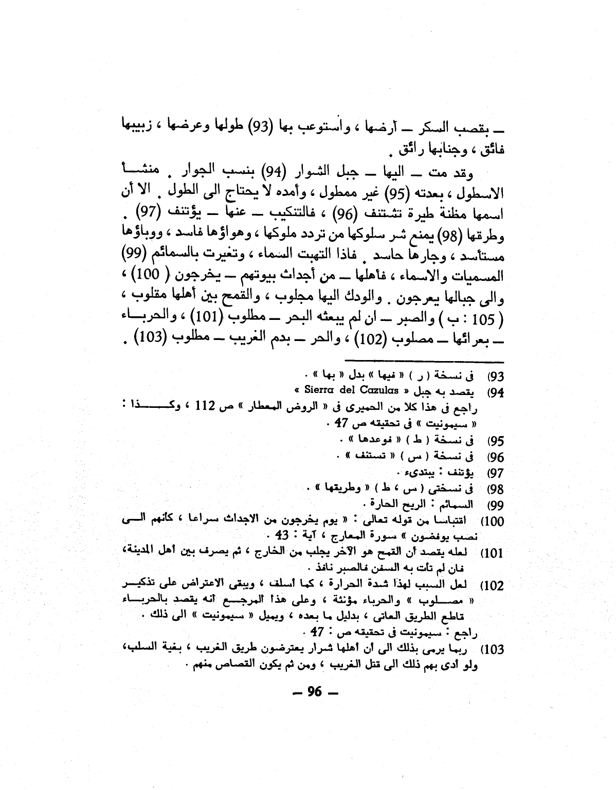 - بقصب السكر- أرضها، واستوعب بها «93» طولها وعرضها، زبيبها فائق، وجنابها رائق.
