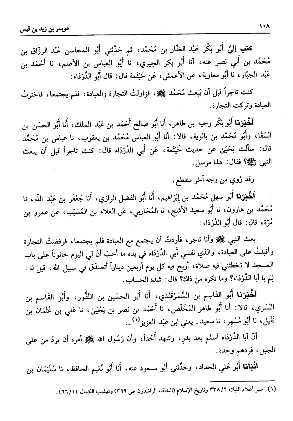 كتب إلي أبو بكر عبد الغفار بن محمد ثم حدثني أبو المحاسن عبد الرزاق بن محمد بن أبي نصر عنه أنا أبو بكر الحيري نا أبو العباس بن الأصم نا أحمد بن عبد الجبار نا أبو معاوية عن الأعمش عن خيثمة قال قال أبو الدرداء كنت تاجرا قبل أن يبعث محمد (صلى الله عليه وسلم) فزاولت التجارة والعبادة فلم يجتمعا فاخترت العبادة وتركت التجارة أخبرنا أبو بكر وجيه بن طاهر أنا أبو صالح أحمد بن عبد الملك أنا أبو الحسن بن السقا وأبو محمد بن بالوية قالا أنا أبو العباس محمد بن يعقوب نا عباس بن محمد قال سألت يحيى عن حديث خيثمة عن أبي الدرداء قال كنت تاجرا قبل أن يبعث النبي (صلى الله عليه وسلم) فقال هذا مرسل وقد روي من وجه آخر منقطع أخبرنا أبو سهل محمد بن إبراهيم أنا أبو الفضل الرازي أنا جعفر بن عبد الله نا محمد بن هارون نا أبو سعيد الأشج نا المحاربي عن العلاء بن المسيب عن عمرو بن مرة قال قال أبو الدرداء بعث النبي (صلى الله عليه وسلم) وأنا تاجر فأردت أن يجتمع مع العبادة فلم يجتمعا فرفضت التجارة وأقبلت على العبادة والذي نفسي أبي الدرداء في يده ما أحب أن لي اليوم حانوتا على باب المسجد لا تخطئني فيه صلاة أربح فيه كل يوم أربعين دينارا أتصدق في سبيل الله قيل له لم يا أبا الدرداء وما تكره من ذاك قال شدة الحساب أخبرنا أبو القاسم بن السمرقندي أنا أبو الحسين بن النقور وأبو القاسم بن البسري قالا أنا أبو طاهر المخلص نا أحمد بن نصر بن يحيى نا علي بن عثمان بن نفيل نا أبو مسهر نا سعيد يعني ابن عبد العزيز ان أبا الدرداء أسلم بعد بدر وشهد أحدا وأن رسول الله (صلى الله عليه وسلم) أمره أن يرد من على الجبل فردهم وحده أنبأنا أبو علي الحداد وحدثني أبو مسعود عنه أنا أبو نعيم الحافظ نا سليمان بن
