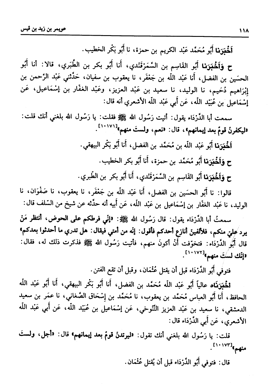 أخبرنا أبو محمد عبد الكريم بن حمزة نا أبو بكر الخطيب ح وأخبرنا أبو القاسم بن السمرقندي أنا أبو بكر بن الطبري قالا أنا أبو الحسين بن الفضل أنا عبد الله بن جعفر نا يعقوب بن سفيان حدثني عبد الرحمن بن إبراهيم دحيم نا الوليد نا سعيد بن عبد العزيز وعبد الغفار بن إسماعيل عن إسماعيل بن عبيد الله عن أبي عبد الله الأشعري أنه قال سمعت أبا الدرداء يقول أتيت رسول الله (صلى الله عليه وسلم) فقلت يا رسول الله بلغني أنك قلت ليكفرن قوم بعد إيمانهم قال نعم ولست منهم أخبرنا أبو عبد الله بن محمد بن الفضل أنا أبو بكر البيهقي ح وأخبرنا أبو محمد بن حمزة أنا أبو بكر الخطيب ح وأخبرنا أبو القاسم بن السمرقندي أنا أبو بكر بن الطبري قالوا نا أبو الحسين بن الفضل أنا عبد الله بن جعفر نا يعقوب نا صفوان نا الوليد نا عبد الغفار بن إسماعيل بن عبد الله عن أبيه أنه حدثه عن شيخ من السلف قال سمعت أبا الدرداء يقول قال رسول الله (صلى الله عليه وسلم) إني فرطكم على الحوض أنتظر من يرد علي منكم فلألفين أنازع أحدكم فأقول إنه من أمتي فيقال هل تدري ما أحدثوا بعدكم قال أبو الدرداء فتخوفت أن أكون منهم فأتيت رسول الله (صلى الله عليه وسلم) فذكرت ذلك له فقال إنك لست منهم فتوفي أبو الدرداء قبل أن يقتل عثمان وقبل أن تقع الفتن أخبرناه عاليا أبو عبد الله محمد بن الفضل أنا أبو بكر البيهقي أنا أبو عبد الله الحافظ أنا أبو العباس محمد بن يعقوب نا محمد بن إسحاق الصغاني نا عمر بن سعيد الدمشقي نا سعيد بن عبد العزيز التنوخي عن إسماعيل بن عبيد الله عن أبي عبد الله الأشعري عن أبي الدرداء قال قلت يا رسول الله بلغني أنك تقول ليرتدن قوم بعد إيمانهم قال أجل ولست منهم قال فتوفي أبو الدرداء قبل أن يقتل عثمان