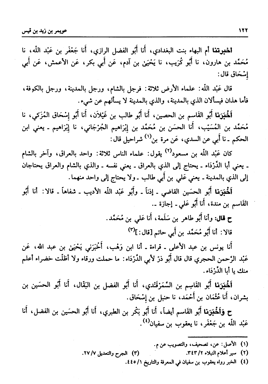 أخبرتنا أم البهاء بنت البغدادي أنا أبو الفضل الرازي أنا جعفر بن عبد الله نا محمد بن هارون نا أبو كريب نا يحيى بن آدم عن أبي بكر عن الأعمش عن ابي إسحاق قال قال عبد الله علماء الأرض ثلاثة فرجل بالشام ورجل بالمدينة ورجل بالكوفة فأما هذان فيسألان الذي والذي بالمدينة بالمدينة لا يسألهم عن شئ أخبرنا أبو القاسم بن الحصين أنا أبو طالب بن غيلان أنا أبو إسحاق المزكي نا محمد بن المسيب أنا الحسن بن محمد بن إبراهيم الجرجاني نا إبراهيم يعني ابن الحكم نا أبي عن السدي عن مرة بن شراحيل قال كان عبد الله بن مسعود يقول علماء الناس ثلاثة واحد بالعراق وآخر بالشام يعني أبا الدرداء يحتاج إلى الذي بالعراق يعني نفسه والذي بالشام والعراق يحتاجان إلى الذي بالمدينة يعني علي بن أبي طالب ولا يحتاج إلى واحد منهما أخبرنا أبو الحسين القاضي إذنا وأبو عبد الله الأديب شفاها قالا أنا أبو القاسم بن مندة أنا أبو علي إجازة ح قال وأنا أبو طاهر بن سلمة أنا علي بن محمد قالا أنا أبو محمد بن أبي حاتم قال أنا يونس بن عبد الأعلى قراءة أنا ابن وهب أخبرني يحيى بن عبد الله عن عبد الرحمن الحجري قال قال أبو ذر لأبي الدرداء ما حملت ورقاء ولا أظلت خضراء أعلم منك يا أبا الدرداء أخبرنا أبو القاسم بن السمرقندي أنا أبو الفضل بن البقال أنا أبو الحسين بن بشران أنا عثمان بن أحمد نا حنبل بن إسحاق ح وأخبرنا أبو القاسم أيضا أنا أبو بكر بن الطبري أنا أبو الحسين بن الفضل أنا عبد الله بن جعفر نا يعقوب بن سفيان
