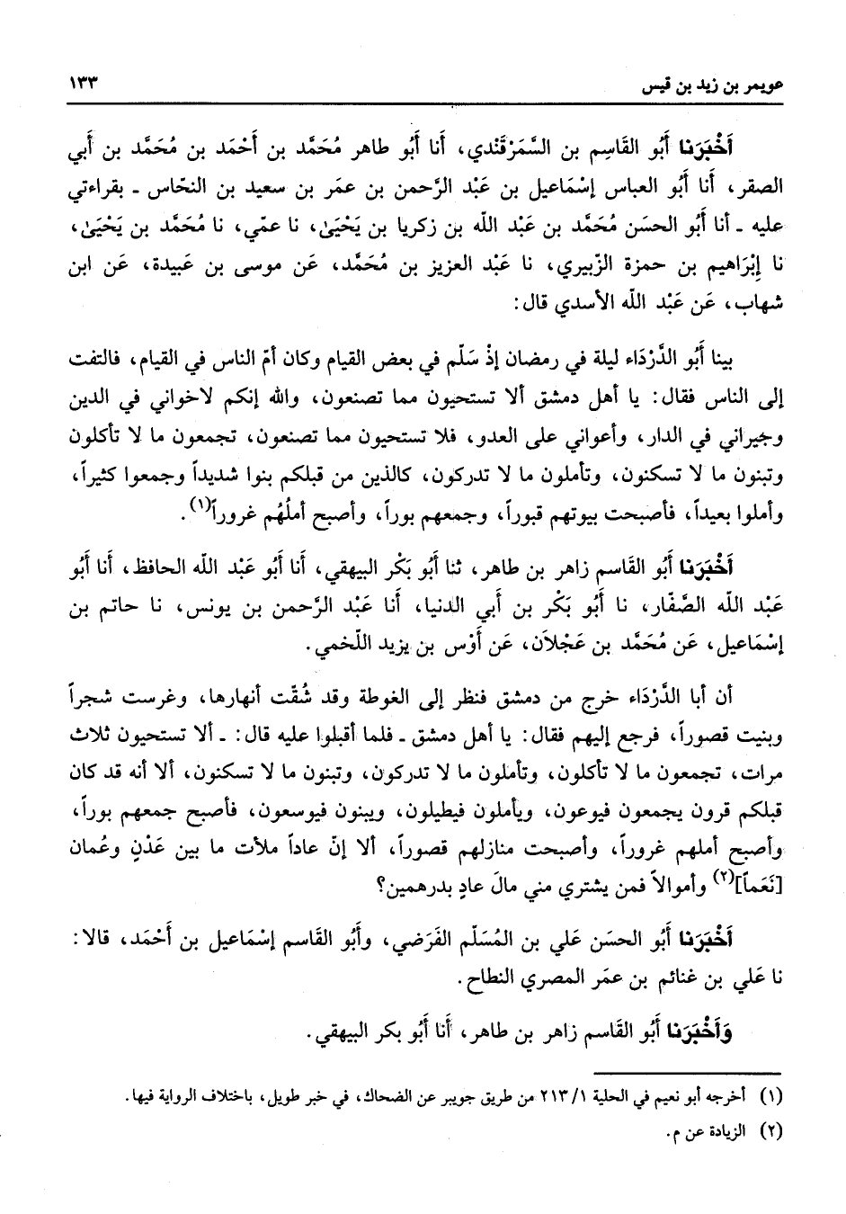 أخبرنا أبو القاسم بن السمرقندي أنا أبو طاهر محمد بن أحمد بن محمد بن أبي الصقر أنا أبو العباس إسماعيل بن عبد الرحمن بن عمر بن سعيد بن النحاس بقراءتي عليه أنا أبو الحسن محمد بن عبد الله بن زكريا بن يحيى نا عمي نا محمد بن يحيى نا إبراهيم بن حمزة الزبيدي نا عبد العزيز بن محمد عن موسى بن عبيدة عن ابن شهاب عن عبد الله الأسدي قال بينا أبو الدرداء في رمضان إذ سلم في بعض القيام وكان أم الناس في القيام فالتفت إلى الناس فقال يا أهل دمشق ألا تستحيون مما تصنعون والله إنكم لاخواني في الدين وجيراني في الدار وأعواني على العدو فلا تستحيون مما تصنعون تجمعون ما لا تأكلون وتبنون ما لا تسكنون وتأملون ما لا تدركون كالذين من قبلكم بنوا شديدا وجمعوا كثيرا وأملوا بعيدا فأصبحت بيوتهم قبورا وجمعهم بورا وأصبح أملهم غرورا أخبرنا أبو القاسم زاهر بن طاهر ثنا أبو بكر البيهقي أنا أبو عبد الله الحافظ أنا أبو عبد الله الصفار نا أبو بكر بن أبي الدنيا أنا عبد الرحمن بن يونس نا حاتم بن إسماعيل عن محمد بن عجلان عن أوس بن يزيد اللخمي أن أبا الدرداء خرج من دمشق فنظر إلى الغوطة وقد شقت أنهارها وغرست شجرا وبنيت قصورا فرجع إليهم فقال يا أهل دمشق فلما أقبلوا عليه قال ألا تستحيون ثلاث مرات تجمعون ما لا تأكلون وتأملون ما لا تدركون وتبنون ما لا تسكنون ألا أنه قد كان قبلكم قرون يجمعون فيوعون ويأملون فيطيلون ويبنون فيوسعون فأصبح جمعهم بورا وأصبح أملهم غرورا وأصبحت منازلهم قصورا ألا إن عادا ملأت ما بين عدن وعمان نعما وأموالا فمن يشتري مني مال عاد بدرهمين أخبرنا أبو الحسن علي بن المسلم الفرضي وأبو القاسم إسماعيل بن أحمد قالا ناعلي بن غنائم بن عمر المصري النطاح وأخبرنا أبو القاسم زاهر بن طاهر أنا أبو بكر البيهقي