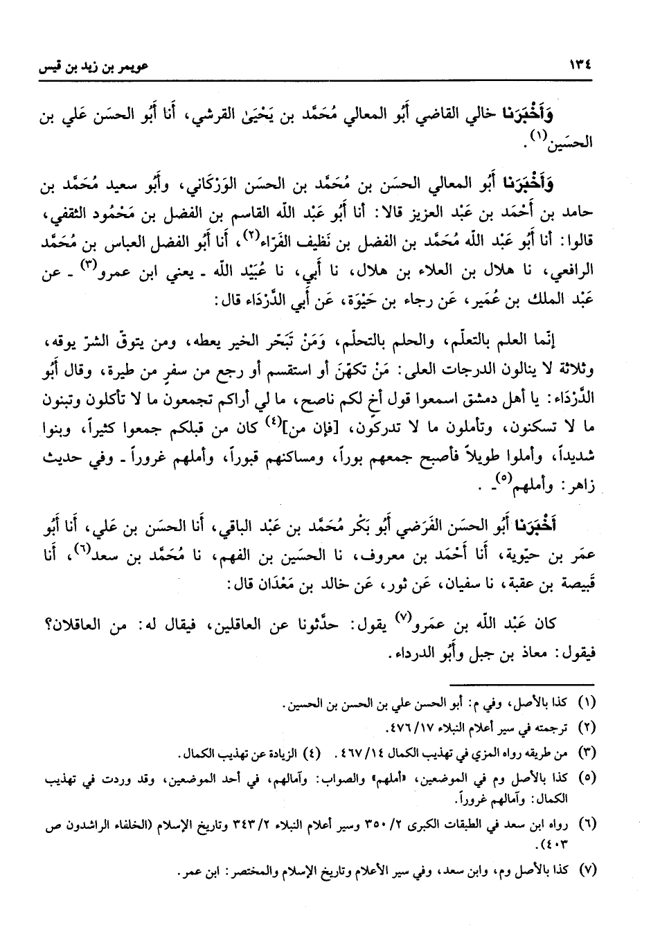 وأخبرنا خالي القاضي أبو المعالي محمد بن يحيى القرشي أنا أبو الحسن علي بن الحسين وأخبرنا أبو المعالي الحسن بن محمد بن الحسن الوركاني وأبو سعيد محمد بن حامد بن أحمد بن عبد العزيز قالا أنا أبو عبد الله القاسم بن الفضل بن محمود الثقفي قالوا أنا أبو عبد الله محمد بن الفضل بن نظيف الفراء أنا أبو الفضل العباس بن محمد الرافعي نا هلال بن العلاء بن هلال نا أبي نا عبيد الله يعني ابن عمرو عن عبد الملك بن عمير عن رجاء بن حيوة عن أبي الدرداء قال إنما العلم بالتعلم والحلم بالتحلم ومن تبحر الخير يعطه ومن يتوق الشر يوقه وثلاثة لا ينالون الدرجات العلى من تكهن أو استقسم أو رجع من سفر من طيرة وقال أبو الدرداء يا أهل دمشق اسمعوا قول أخ لكم ناصح ما لي أراكم تجمعون ما لا تأكلون وتبنون ما لا تسكنون وتأملون ما لا تدركون فإن من كان من قبلكم جمعوا كثيرا وبنوا شديدا وأملوا طويلا فأصبح جمعهم بورا ومساكنهم قبورا وأملهم غرورا وفي حديث زاهر وأملهم أخبرنا أبو الحسن الفرضي أبو بكر محمد بن عبد الباقي أنا الحسن بن علي أنا أبو عمربن حيوية أنا أحمد بن معروف نا الحسين بن الفهم نا محمد بن سعد أنا قبيصة بن عقبة نا سفيان عن ثور عن خالد بن معدان قال كان عبد الله بن عمرو يقول حدثونا عن العاقلين فيقال له من العاقلان فيقول معاذ بن جبل وأبو الدرداء