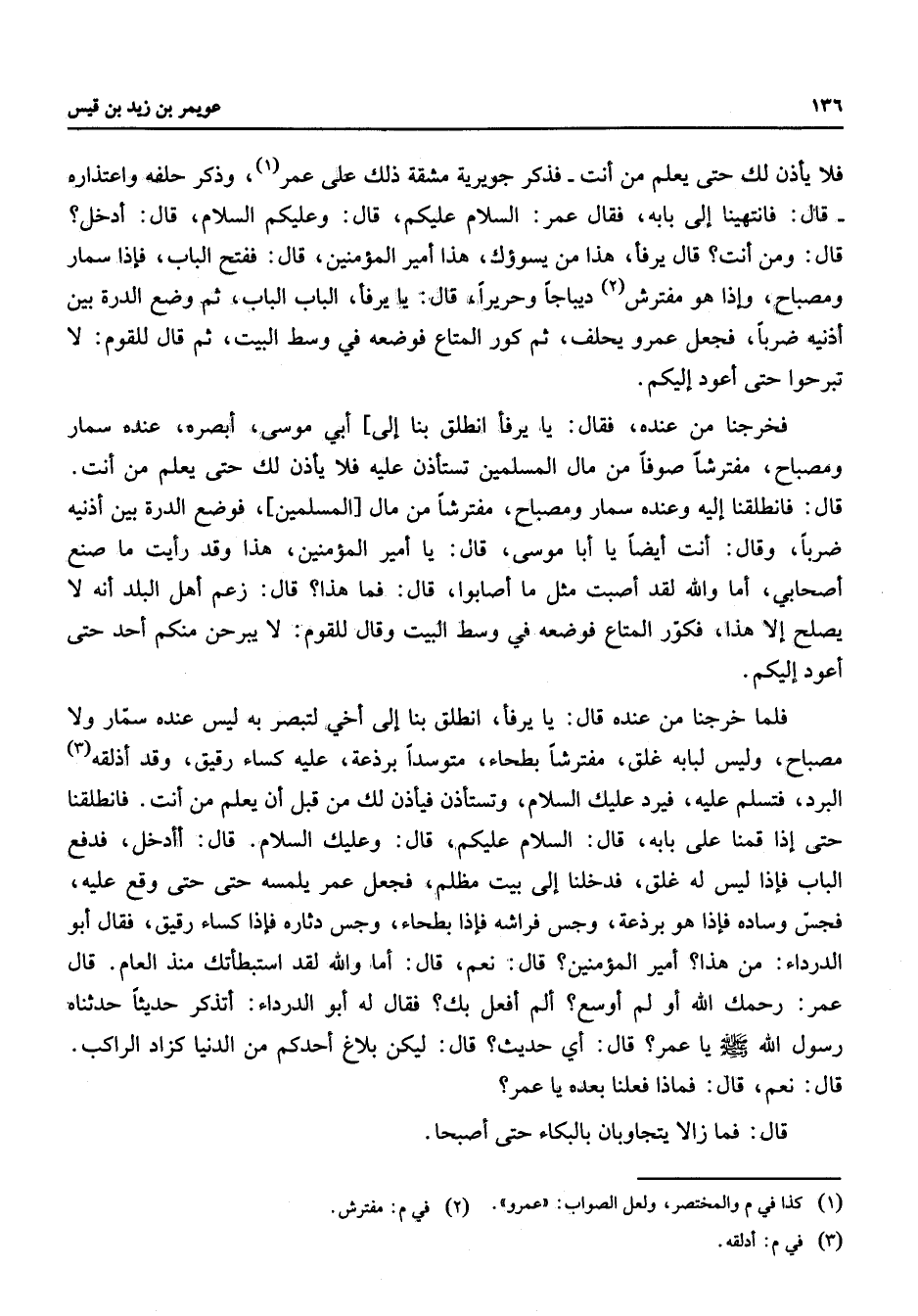 فلا يأذن لك حتى يعلم من أنت فذكر جويرية مشقة ذلك على عمر وذكر حلفه واعتذاره قال فانتهينا إلى بابه فقال عمر السلام عليكم قال وعليكم السلام قال أدخل قال ومن أنت قال يرفأ هذا من يسوؤك هذا أمير المؤمنين قال ففتح الباب فإذا سمار ومصباح وإذا هو مفترش ديباجا وحريرا قال يا يرفأ الباب الباب ثم وضع الدرة بين أذنيه ضربا فجعل عمرو يحلف ثم كور المتاع فوضعه في وسط البيت ثم قال للقوم لا تبرحوا حتى أعود إليكم فخرجنا من عنده فقال يا يرفأ انطلق بنا إلى أبي موسى أبصره عنده سمار ومصباح مفترشا صوفا من مال المسلمين عليه فلا يأذن لك حتى يعلم من أنت قال فانطلقنا إليه وعنده سمار ومصباح مفترشا من مال المسلمين فوضع الدرة بين أذنيه ضربا وقال أنت أيضا يا أبا موسى قال يا أمير المؤمنين هذا وقد رأيت ما صنع أصحابي أما والله لقد أصبت مثل ما أصابوا قال فما هذا قال زعم أهل البلد أنه لا يصلح إلا هذا فكور المتاع فوضعه في وسط البيت وقال للقوم لا يبرحن منكم أحد حتى أعود إليكم فلما خرجنا من عنده قال يا يرفأ انطلق بنا إلى أخي لتبصر به ليس عنده سمار ولا مصباح وليس لبابه غلق مفترشا بطحاء متوسدا برذعة عليه كساء رقيق وقد أذلقه البرد فتسلم عليه فيرد عليك السلام وتستأذن فيأذن لك من قيل أن يعلم من أنت فانطلقنا حتى إذا قمنا على بابه قال السلام عليكم قال وعليك السلام قال أأدخل فدفع الباب فإذاليس له غلق فدخلنا إلى بيت مظلم فجعل عمر يلمسه حتى حتى وقع عليه فجس وساده فإذا هو برذعة وجس فراشه فإذا بطحاء وجس دثاره فإذا كساء رقيق فقال أبو الدرداء من هذا أمير المؤمنين قال نعم قال أما والله لقد استبطأتك منذ العام قال عمر رحمك الله أو لم أوسع ألم أفعل بك فقال له أبو الدرداء أتذكر حديثا حدثناه رسول الله (صلى الله عليه وسلم) يا عمر قال أي حديث قال ليكن بلاغ أحدكم من الدنيا كزاد الراكب قال نعم قال فماذا فعلنا بعده يا عمر قال فما زالا يتجاوبان بالبكاء حتى أصبحا