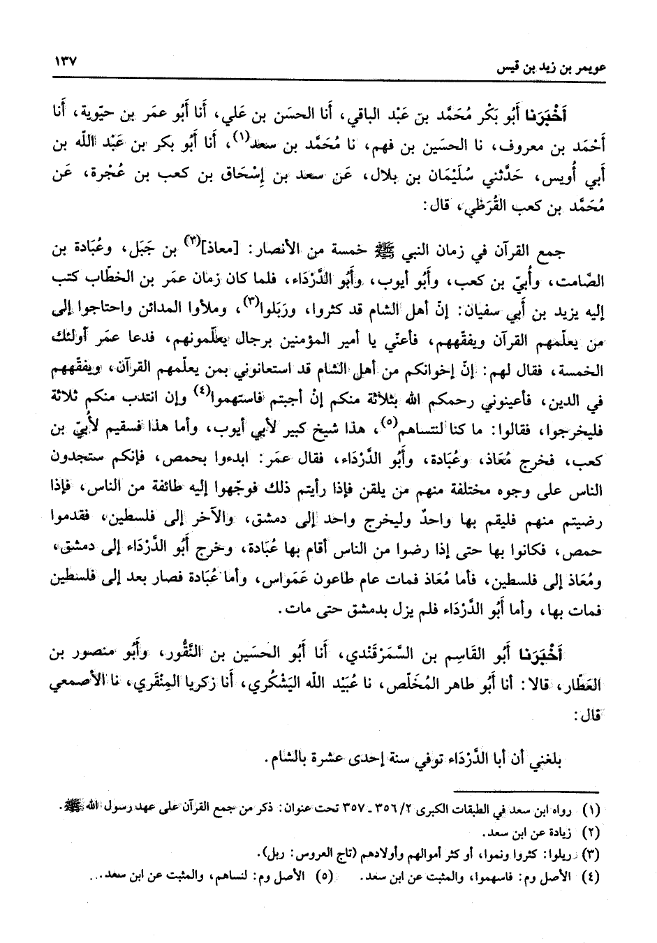 1 - رواه ابن سعد في الطبقات الكبرى 2 / 356 - 357 تحت عنوا ن: ذكر من جمع القرآن على عهد رسول الله (ص) 2 - زيادة عن ابن سعد