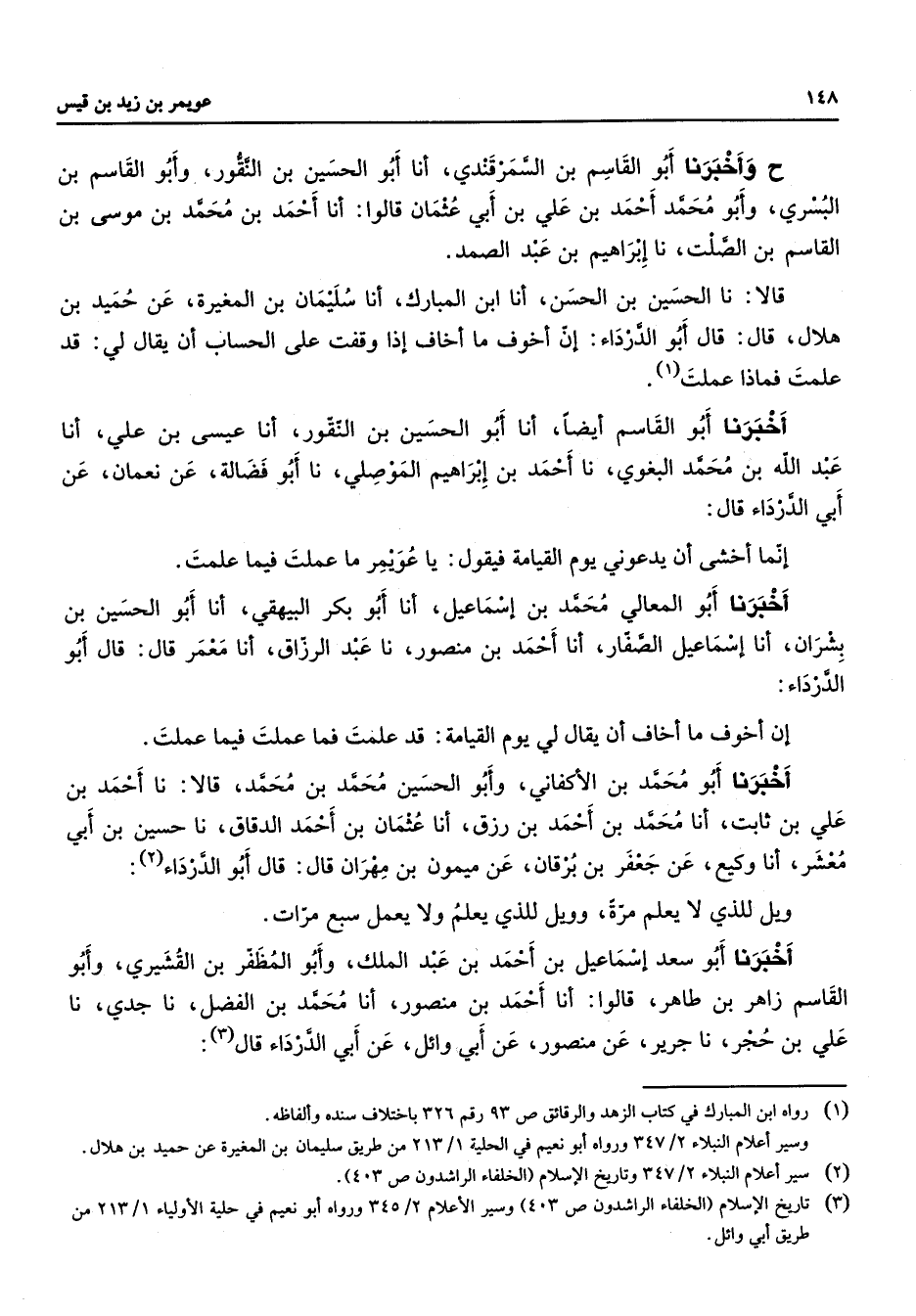 ح وأخبرنا أبو القاسم بن السمرقندي أنا أبو الحسين بن النقور وأبو القاسم بن البسري وأبو محمد أحمد بن علي بن أبي عثمان قالوا أنا أحمد بن محمد بن موسى بن القاسم بن الصلت نا أبراهيم بن عبد الصمد قالا نا الحسين بن الحسن أنا ابن المبارك أنا سليمان بن المغيرة عن حميد بن هلال قال قال أبو الدرداء إن أخوف ما أخاف إذا وقفت على الحساب أن يقال لي قد علمت فماذا عملت أخبرنا أبو القاسم أيضا أنا أبو الحسين بن النقور أنا عيسى بن علي أنا عبد الله بن محمد البغوي نا أحمد بن إبراهيم الموصلي نا أبو فضالة عن نعمان عن أبي الدرداء قال إنما أخشى أن يدعوني يوم القيامة فيقول يا عويمر ما عملت فيما علمت أخبرنا أبو المعالي محمد بن إسماعيل أنا أبو بكر البيهقي أنا أبو الحسين بن بشران أنا إسماعيل الصفار أنا أحمد بن منصور نا عبد الرزاق أنا معمر قال قال أبو الدرداء إن أخوف ما أخاف أن يقال لي يوم القيامة قد علمت فما عملت فيما عملت أخبرنا أبو محمد بن الأكفاني وأبو الحسين محمد بن محمد قالا نا أحمد بن علي بن ثابت أنا محمد بن أحمد بن رزق أنا عثمان بن أحمد الدقاق نا حسين بن أبي معشر أنا وكيع عن جعفر بن برقان عن ميمون بن مهران قال قال أبو الدرداء ويل للذي لا يعلم مرة وويل للذي يعلم ولا يعمل سبع مرات أخبرنا أبو سعد إسماعيل بن أحمد بن عبد الملك وأبو المظفر بن القشيري وأبو القاسم زاهر بن طاهر قالوا أنا أحمد بن منصور أنا محمد بن الفضيل نا جدي نا علي بن حجرنا جرير عن منصور عن أبي وائل عن أبي الدرداء قال