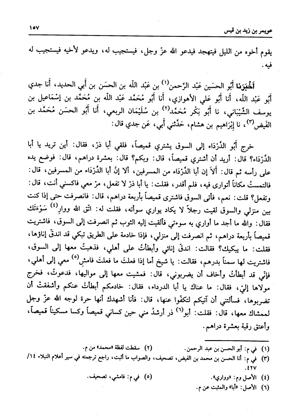 يقوم أخوه من الليل فيتهجد فيدعو الله عزوجل فيستجيب له ويدعو لأخيه فيستجيب له فيه أخبرنا أبو الحسين عبد الرحمن بن عبد الله بن الحسن بن أبي الحديد أنا جدي أبو عبد الله أنا أبو علي الأهوازي أنا أبو محمد عبد الله بن محمد بن إسماعيل بن يوسف الشيباني نا أبو بكر محمد بن سليمان الربعي أنا أبو الحسن محمد بن الفيض نا إبراهيم بن هشام حدثني أبي عن جدي قال خرج أبو الدرداء إلى السوق يشتري قميصا فلقي أبا ذر فقال أين تريد يا أبا الدرداء قال أريد أن اشتري قميصا قال وبكم قال بعشرة دراهم قال فوضع يده على رأسه ثم قال ألا إن أبا الدرداء من المسرفين قال فالتمست مكانا أتوارى فيه فلم أقدر فقلت يا أبا ذر لا تفعل مر معي فاكسني أنت قال وتفعل قلت نعم فأتى السوق فاشترى قميصا بأربعة دراهم قال فانصرفت حتى إذا كنت بين منزلي والسوق لقيت رجلا لا يكاد يواري سوأته فقلت له اتق الله ووار سوأتك فقال والله ما أجد ما أواري به سوأتي فألقيت إليه الثوب ثم انصرفت إلى السوق فاشتريت قميصا بأربعة دراهم ثم انصرفت إلى منزلي فإذا خادمة على الطريق تبكي قد اندق إناؤها فقلت ما يبكيك فقال اندق أنائي وأبطأت على أهلي فذهبت معها إلى السوق فاشتريت لها سمنا بدرهم فقالت يا شيخ أما إذا فعلت ما فعلت فامش معي إلى أهلي فإني قد أبطأت وأخاف أن يضربوني قال فمشيت معها إلى مواليها فدعوت فخر مولاها إلي فقال ما عناك يا أبا الدرداء فقال خادمكم أبطأت عنكم وأشفقت أن تضربوها فسألتني أن آتيكم لتكفوا عنها قال فأنا أشهدك أنها حرة لوجه الله عزوجل لممشاك معها قال فقلت أبو ذر أرشد مني حين كساني قميصا وكسا مسكينا قميصا وأعتق رقبة بعشرة دراهم