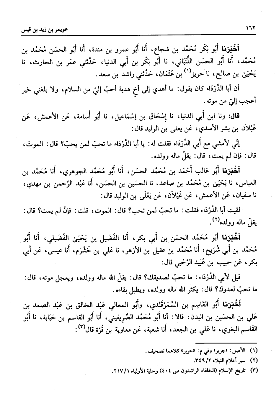 أخبرنا أبو بكر محمد بن شجاع أنا أبو عمرو بن مندة أنا أبو الحسن محمد بن محمد أنا أبو الحسن اللنباني نا أبو بكر بن أبي الدنيا حدثني عمر بن الحارث نا يحيى بن صالح نا حريز بن عثمان حدثني راشد بن سعد أن أبا الدرداء كان يقول ما أهدي إلى أخ هدية أحب إلي من السلام ولا بلغني خير إعجب إلي من موته قال ونا ابن أبي الدنيا نا إسحاق بن إسماعيل نا أبو أسامة عن الأعمش عن غيلان بن بشر الأسدي عن يعلى بن الوليد قال إني لأمشي مع أبي الدرداء فقلت له يا أبا الدرداء ما تحب لمن يحب قال الموت قال فإن لم يمت قال يقل ماله وولده أخبرنا أبو غالب أحمد بن محمد الحسن أنا أبو محمد الجوهري أنا محمد بن العباس نا يحيى بن محمد بن صاعد نا الحسين بن الحسن أنا عبد الرحمن بن مهدي نا سفيان عن الأعمش عن غيلان عن يعلى بن الوليد قال لقيت أبا الدرداء فقلت ما تحب لمن تحب قال الموت قلت فإن لم يمت قال يقل ماله وولده أخبرنا أبو محمد الحسن بن أبي بكر أنا الفضيل بن يحيى الفضيلي أنا أبو محمد بن أبي شريح أنا محمد بن عقيل بن الأزهر نا علي بن خشرم أنا عيسى عن أبي بكر عن حبيب بن عبيد الرحبي قال قيل لأبي الدرداء ما تحب لصديقك قال يقل الله ماله وولده ويعجل موته قال ما تحب لعدوك قال يكثر الله ماله وولده ويطيل بقاءه أخبرنا أبو القاسم بن السمرقندي وأبو المعالي عبد الخالق بن عبد الصمد بن علي بن الحسين بن البدن قالا أنا أبو محمد الصريفيني أنا أبو القاسم بن حبابة نا أبو القاسم البغوي نا علي بن الجعد أنا شعبة عن معاوية بن قرة قال