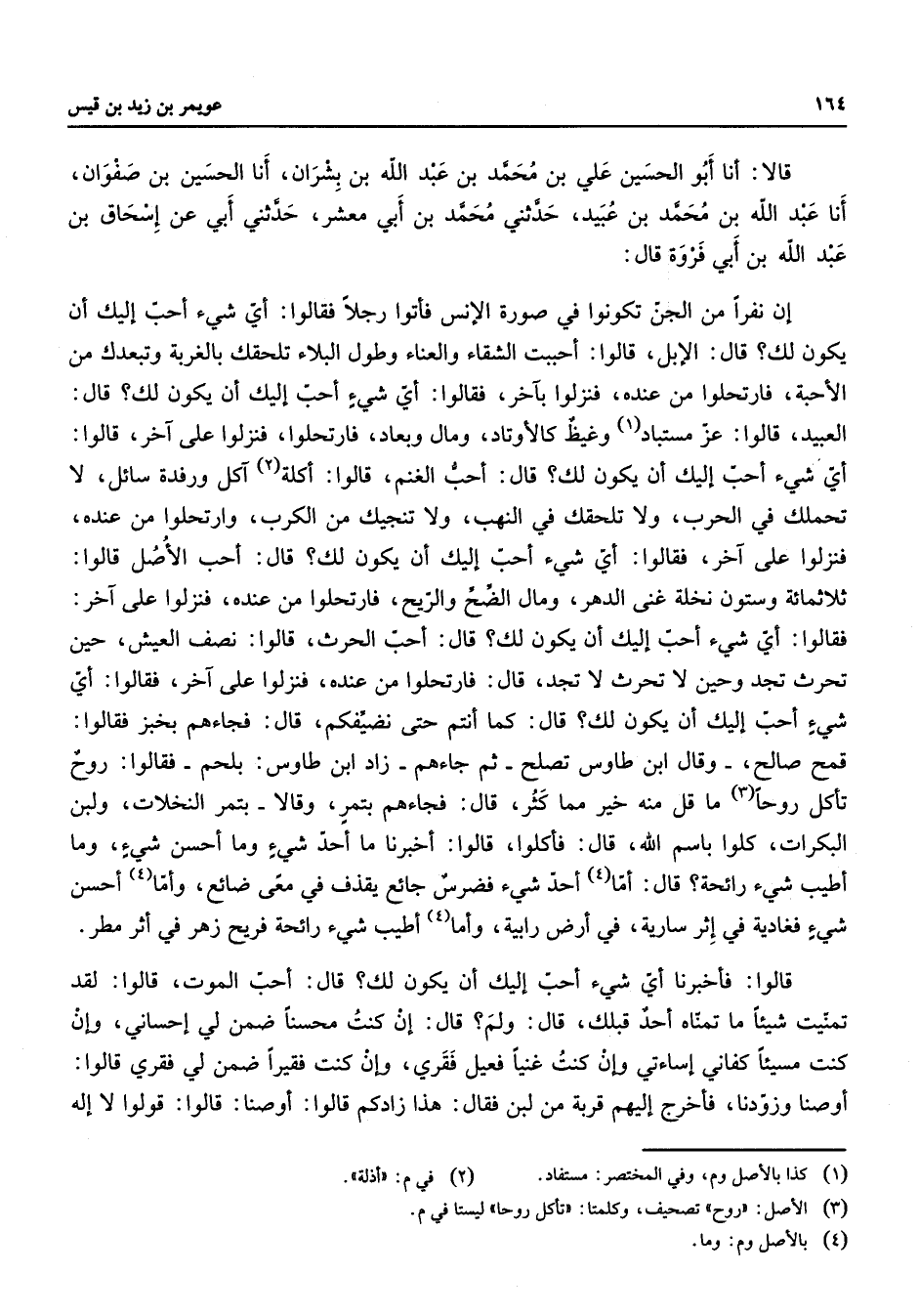 قالا أنا أبو الحسين علي بن محمد بن عبد الله بن بشران أنا الحسين بن صفوان أنا عبد الله بن محمد بن عبيد حدثني محمد بن أبي معشر حدثني أبي عن إسحاق بن عبد الله بن أبي فروة قال إن نفرا من الجن تكونوا في صورة الإنس فأتوا رجلا فقالوا أي شئ أحب إليك أن يكون لك قال الإبل قالوا أحببت الشقاء والعناء وطول البلاء تلحقك بالغربة وتبعدك من الأحبة فارتحلوا من عنده فنزلوا بآخر فقالوا أي شئ أحب إليك أن يكون لك قال العبيد قالوا عز مستباد وغيظ كالأوتاد ومال وبعاد فارتحلوا فنزلوا على آخر قالوا أي شئ أحب إليك أن يكون لك قال أحب الغنم قالوا أكلة آكل ورفدة سائل لا تحملك في الحرب ولا تلحقك في النهب ولا تنجيك من الكرب وارتحلوا من عنده فنزلوا على آخر فقالوا أي شئ أحب إليك أن يكون لك قال أحب الأصل قالوا ثلاثمائة وستون نخلة غنى الدهر ومال الضح والريح فارتحلوا من عنده فنزلوا على آخر فقالوا أي شئ أحب إليك أن يكون لك قال أحب الحرث قالوا نصف العيش حين تحرث تجد وحين لا تحرث لا تجد قال فارتحلوا من عنده فنزلوا على آخر فقالوا أي شئ أحب إليك أن يكون لك قال كما أنتم حتى نضيفكم قال فجاءهم بخبز فقالوا قمح صالح وقال ابن طاوس تصلح ثم جاءهم زاد ابن طاوس بلحم فقالوا روح تأكل روحاما قل منه خير مما كثر قال فجاءهم بتمر وقالا بتمر النخلات ولبن البكرات كلوا باسم الله قال فأكلوا قالوا أخبرنا ما أحد شئ وما أحسن شئ وما أطيب شئ رائحة قال أما أحد شئ فضرس جائع يقذف في معي ضائع وأما أحسن شئ فغادية في إثر سارية في أرض رابية وأما أطيب شئ رائحة فريح زهر في أثر مطر قالوا فأخبرنا أي شئ أحب إليك أن يكون لك قال أحب الموت قالوا لقد تمنيت شيئا ما تمناه أحد قبلك قال ولم قال إن كنت محسنا ضمن لي إحساني وإن كنت مسيئاكفاني إساءتي وإن كنت غنيا فعيل فقري وإن كنت فقيرا ضمن لي فقري قالوا أوصنا وزودنا فأخرج إليهم قربة من لبن فقال (هذا زادكم قالوا أوصنا قالوا قالوا لا إله