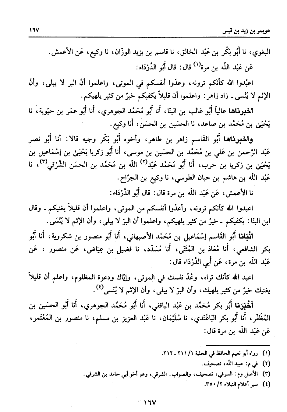البغوي نا أبو بكر بن عبد الخالق نا قاسم بن يزيد الوزان نا وكيع عن الأعمش عن عبد الله بن مرة قال قال أبو الدرداء اعبدوا الله كأنكم ترونه وعدوا أنفسكم في الموتى واعلموا أن البر لا يبلى وأن الإثم لا ينسى زاد زاهر واعلموا أن قليلا يكفيكم خير من كثير يلهيكم أخبرناها عاليا أبو غالب بن البنا أنا أبو محمد الجوهري أنا أبو عمر بن حيوية نا يحيى بن محمد بن صاعد نا الحسين بن الحسن أنا وكيع وأخبرناها أبو القاسم زاهر بن طاهر وأخوه أبو بكر وجيه قالا أنا أبو نصر عبد الرحمن بن علي بن محمد بن الحسين بن موسى أنا أبو زكريا يحيى بن إسماعيل بن يحيى بن زكريا بن حرب أنا أبو محمد عبد الله بن محمد بن الحسن الشرقي نا عبد الله بن هاشم بن حبان الطوسي نا وكيع بن الجراح نا الأعمش عن عبد الله بن مرة قال قال أبو الدرداء أعبدوا الله كأنكم ترونه وأعدوا أنفسكم من الموتى واعلموا أن قليلا يغنيكم وقال ابن البنا يكفيكم خير من كثير يلهيكم واعلموا أن البر لا يبلى وأن الإثم لا ينسى أنبأنا أبو القاسم إسماعيل بن محمد الأصبهاني أنا أبو منصور بن شكروية أنا أبو بكر الشافعي أنا معاذ بن المثنى أنا مسدد نا فضيل بن عياض عن منصور عن عبد الله بن مرة عن أبي الدرداء قال اعبد الله كأنك تراه وعد نفسك في الموتى وإياك ودعوة المظلوم واعلم أن قليلا يغنيك خير من كثير يلهيك وأن البر لا يبلى وأن الإثم لا ينسى أخبرنا أبو بكر محمد بن عبد الباقفي أنا أبو محمد الجوهري أنا أبو الحسين بن المظفر أنا أبو بكر الباغندي نا سليمان نا عبد العزيز بن مسلم نا منصور بن المعتمر عن عبد الله بن مرة قال