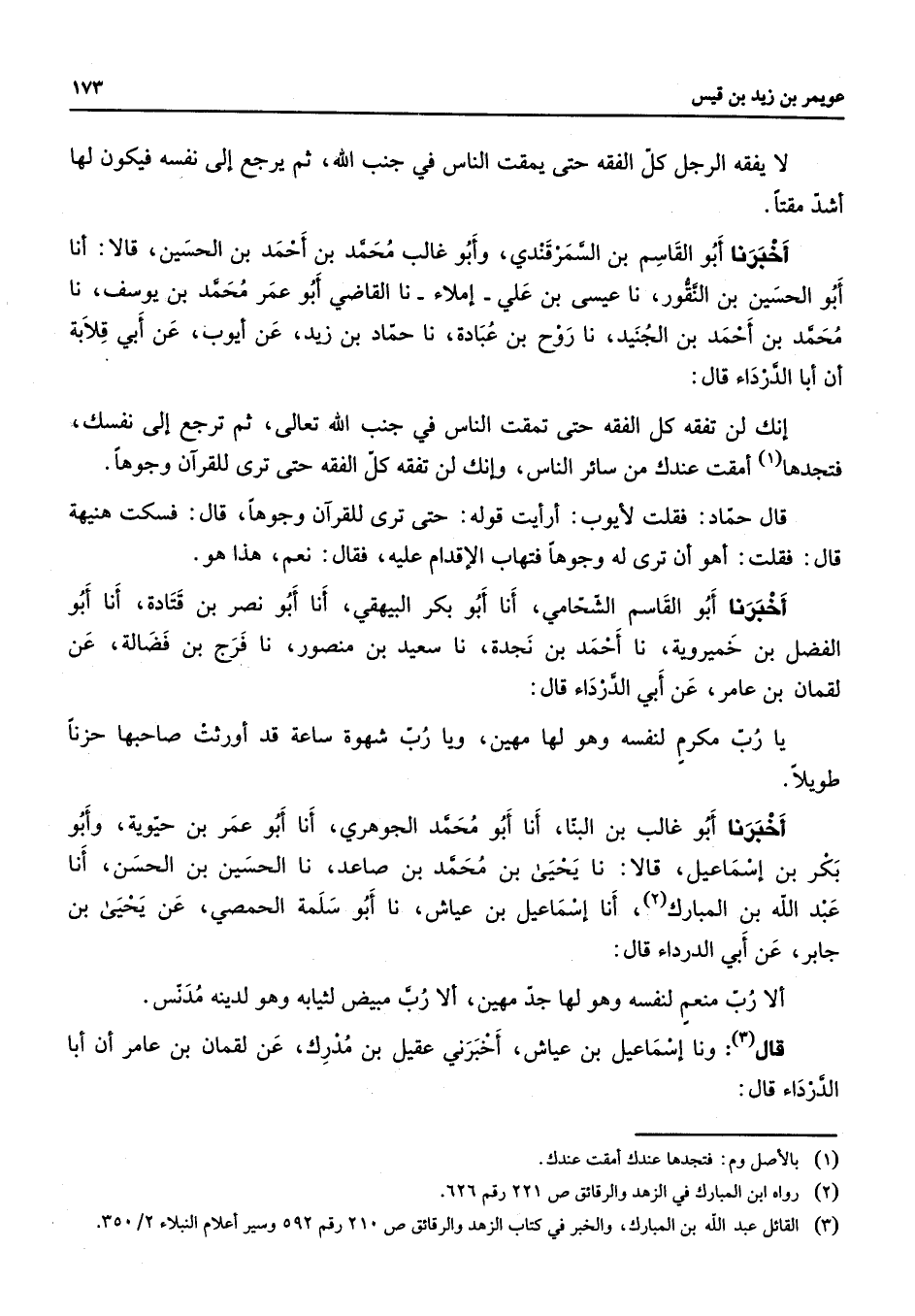 لا يفقه الرجل كل الفقه حتى يمقت في جنب الله ثم يرجع إلى نفسه فيكون لها أشد مقتا أخبرنا أبو القاسم بن السمرقندي وأبو غالب محمد بن أحمد بن الحسين قالا أنا أبو الحسين بن النقور نا عيسى بن علي أملاء نا القاضي أبو عمر محمد بن يوسف نا محمد بن أحمد بن الجنيد نا روح بن عبادة نا حماد بن زيد عن أيوب عن أبي قلابة أن أبا الدرداء قال إنك لن تفقه كل الفقه حتى تمقت الناس في جنب الله تعالى ثم ترجع إلى نفسك فتجدها أمقت عندك من سائر الناس وإنك لن تفقه كل الفقه حتى ترى للقرآن وجوها قال حماد فقلت لأيوب أرأيت قوله حتى ترى للقرآن وجوها قال فسكت هنيهة قال فقلت أهو أن ترى له وجوها فتهاب الإقدام عليه فقال نعم هذا هو أخبرنا أبو القا سم الشحامي أنا أبو بكر البيهقي أنا أبو نصر بن قتادة أنا أبو الفضل بن خميروية نا أحمد بن نجدة نا سعيد بن منصور نا فرج بن فضالة عن لقمان بن عامر عن أبي الدرداء قال يا رب مكرم لنفسه وهو لها مهين ويا رب شهوة ساعة قد أورثت صاحبها حزنا طويلا أخبرنا أبو غالب بن البنا أنا أبو محمد الجوهري أنا أبو عمربن حيوية وأبو بكر بن إسماعيل قالا نا يحيى بن محمد بن صاعد نا الحسين بن الحسن أنا عبد الله بن المبارك أنا إسماعيل بن عياش نا أبو سلمة الحمصي عن يحيى بن جابر عن أبي الدرداء قال ألا رب منعم لنفسه وهو لها جد مهين ألا رب مبيض لثيابه وهو لدينه مدنس قال ونا إسماعيل بن عياش أخبرني عقيل بن مدرك عن لقمان بن عامر أن ابا الدرداء قال