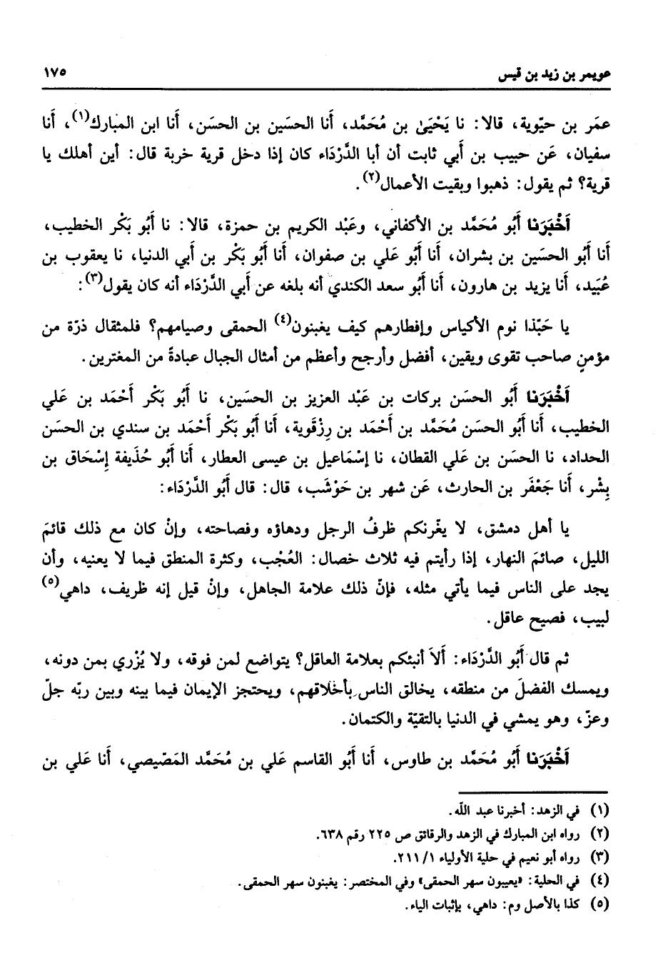 عمر بن حيوية قالا نا يحيى بن محمد أنا الحسين بن الحسن أنا ابن المبارك أنا سفيان عن حبيب بن أبي ثابت أن أبا الدرداء كان إذا دخل قرية خربة قال أين أهلك يا قرية ثم يقول ذهبوا وبقيت الأعمال أخبرنا أبو محمد بن الأكفاني وعبد الكريم بن حمزة قالا نا أبو بكر الخطيب أنا أبو الحسين بن بشران أنا أبو علي بن صفوان أنا أبو بكر بن أبي الدنيا نا يعقوب بن عبيد أنا يزيد بن هارون أنا أبو سعد الكندي أنه بلغه عن أبي الدرداء أنه كان يقول يا حبذا نوم الأكياس وإفطارهم كيف يغبنون الحمقى وصيامهم فلمثقال ذرة من مؤمن صاحب تقوى ويقين أفضل وأرجح وأعظم من أمثال الجبال عبادة من المغترين أخبرنا أبو الحسن بركات بن عبد العزيز بن الحسين نا أبو بكر أحمد بن علي الخطيب أنا أبو الحسن محمد بن أحمد بن رزقوية أنا أبو بكر أحمد بن سندي بن الحسن الحداد نا الحسن بن علي القطان نا إسماعيل بن عيسى العطار أنا أبو حذيفة إسحاق بن بشر أنا جعفر بن الحارث عن شهر بن حوشب قال قال أبو الدرداء يا أهل دمشق لا يغرنكم ظرف الرجل ودهاؤه وفصاحته وإن كان مع ذلك قائم الليل صائم النهار إذا رأيتم فيه ثلاث خصال العجب وكثرة المنطق فيما لا يعنيه وأن يجد على الناس فيما يأتي مثله فإن ذلك علامة الجاهل وإن قيل إنه ظريف داهي لبيب فصيح عاقل ثم قال أبو الدرداء ألا أنبئكم بعلامة العاقل يتواضع لمن فوقه ولا يزري بمن دونه ويمسك الفضل من منطقه يخالق الناس بأخلاقهم ويحتجز الإيمان فيما بينه وبين ربه جل وعز وهو يمشي في الدنيا بالتقية والكتمان أخبرنا أبو محمد بن طاوس أنا أبو القاسم علي بن محمد المصيصي أنا علي بن