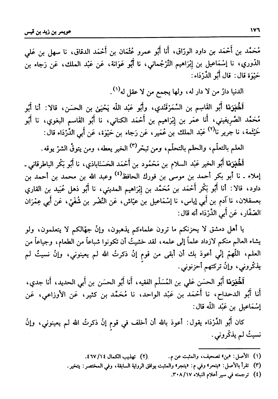 محمد بن احمد بن داود الوراق أنا أبو عمرو عثمان بن أحمد الدقاق نا سهل بن علي الدوري نا إسماعيل بن إبراهيم الترجماني نا أبو عوانة عن عبد الملك عن رجاء بن حيوة قال قال أبو الدرداء الدنيا دار من لا دار لولها يجمع من لا عقل له أخبرنا أبو القاسم بن السمرقندي وأبو عبد الله يحيى بن الحسن قالا أنا أبو محمد الصريفيني أنا عمر بن إبراهيم بن أحمد الكناني نا أبو القاسم البغوي نا أبو خيثمة نا جرير نا عبد الملك بن عمير عن رجاء بن حيوة عن أبي الدرداء قال العلم بالتعلم والحلم بالتحلم ومن تبحر الخير يعطه ومن يتوق الشر يوقه أخبرنا أبو الخير عبد السلام بن محمود بن أحمد الحسناباذي نا أبو بكر الباطرقاني أملاء نا أبو بكر أحمد بن موسى بن فورك الحافظ وعبد الله بن محمد بن أحمد بن داود قالا أنا أبو بكر أحمد بن محمد بن إبراهيم المديني نا أبو ذهل عبيد بن القاري بعسقلان نا آدم بن أبي إياس نا إسماعيل بن عياش عن النضر بن شفي عن أبي عمران الصفار عن أبي الدرداء أنه قال يا أهل دمشق لا يحزنكم ما ترون علماءكم يذهبون وإن جهالكم لا يتعلمون ولو يشاء العالم منكم لازداد علما إلى علمه لقد خشيت أن تكونوا شباعا من الطعام وجياعا من العلم اللهم إني أعوذ بك أن أبقى من قوم إن ذكرت الله لم يعينوني وإن نسيت لم يذكروني وإن تركتهم أحزنوني أخبرنا أبو الحسن علي بن المسلم الفقيه أنا أبو الحسن نبن أبي الحديد أنا جدي أنا أبو الدحداح نا أحمد بن عبد الواحد نا محمد بن كثير عن الأوزاعي عن إسماعيل بن عبد الله قال كان أبو الدرداء يقول أعوذ بالله أن اخلف في قوم إن ذكرت الله لم يعينوني وإن نسيت لم يذكروني
