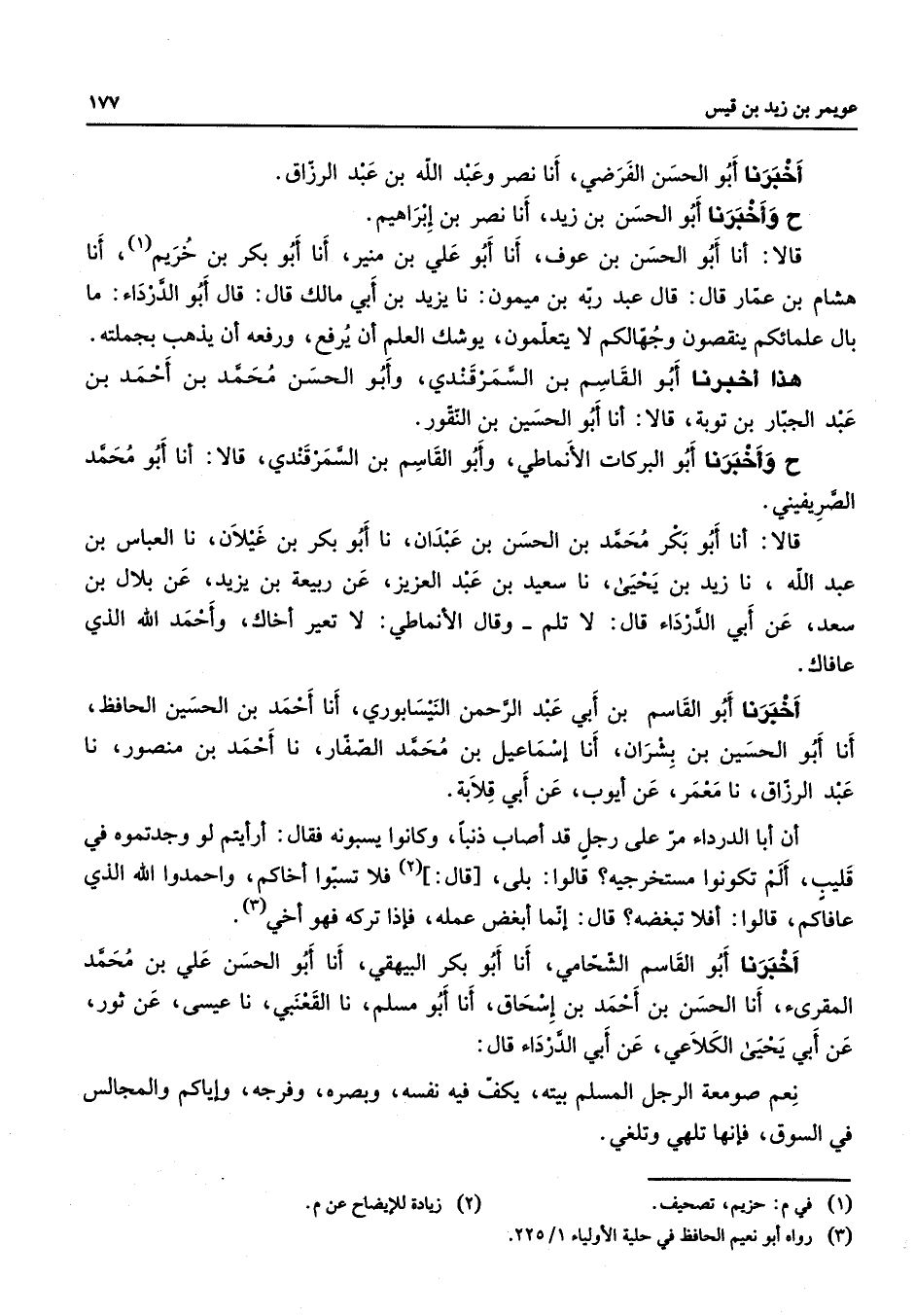 أخبرنا أبو الحسن الفرضي أنا نصر وعبد الله بن عبد الرزاق ح وأخبرنا أبو الحسن بن زيد أنا نصر بن إبراهيم قالا أنا أبو الحسن بن عوف أنا أبو علي بن منير أنا أبو بكر بن خريم أنا هشام بن عمار قال قال عبد ربه بن ميمون نا يزيد بن أبي مالك قال قال أبو الدرداء ما بال علمائكم ينقصون وجهالكم لا يتعلمون يوشك العلم أن يرفع ورفعه أن يذهب بجملته هذا أخبرنا أبو القاسم بن السمرقندي وأبو الحسن محمد بن أحمد بن عبد الجبار بن توبة قالا أنا أبو الحسين بن النقور ح وأخبرنا أبو البركات الأنماطي وأبو القاسم بن السمرقندي قالا أنا أبو محمد الصريفيني قالا أنا أبو بكر محمد بن الحسن بن عبدان نا أبو بكر بن غيلان نا العباس بن عبد الله نا زيد بن يحيى نا سعيد بن عبد العزيز عن ربيعة بن يزيد عن بلال بن سعد عن أبي الدرداء قال لا تلم وقال الأنماطي لا تعير أخاك وأحمد الله الذي عافاك أخبرنا أبو القاسم بن أبي عبد الرحمن النيسابوري أنا أحمد بن الحسين الحافظ أنا أبو الحسين بن بشران أنا إسماعيل بن محمد الصفار نا أحمد بن منصور نا عبد الرزاق نا معمر عن أيوب عن أبي قلابة أن أبا الدرداء مر على رجل قد أصاب ذنبا وكانوا يسبونه فقال أرأيتم لو وجدتموه في قليب ألم تكونوا مستخرجيه قالوا بلى قال فلا تسبوا أخاكم واحمدوا الله الذي عافاكم قالوا أفلا تبغضه قال إنما أبغض عمله فإذا تركه فهو أخي أخبرنا أبو القاسم الشحامي انا أبو بكر البيهقي أنا أبو الحسن علي بن محمد المقرئ أنا الحسن بن أحمد بن إسحاق أنا أبو مسلم نا القعنبي نا عيسى عن ثور عن أبي يحيى الكلاعي عن أبي الدرداء قال نعم صومعة الرجل المسلم بيته يكف فيه نفسه وبصره وفرجه وإياكم والمجالس في السوق فإنها تلهي وتلغي
