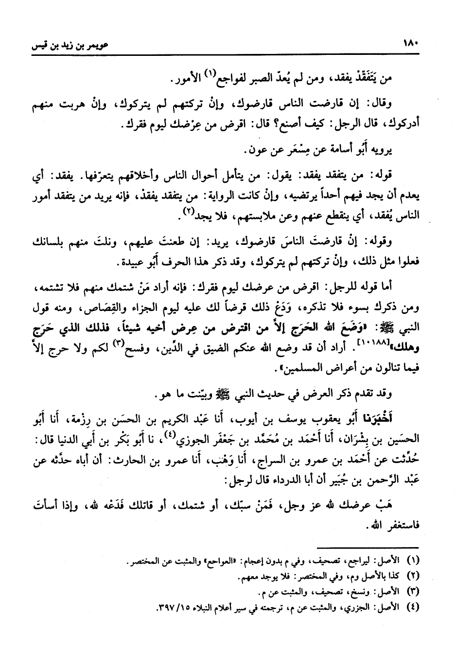من يتفقد يفقد ومن لم يعد الصبر لفواجع الأمور وقال إن قارضت الناس قارضوك وإن تركتهم لم يتركوك وإن هربت منهم أدركوك قال الرجل كيف أصنع قال اقرض من عرضك ليوم فقرك يرويه أبو أسامة عن مسعر عن عون قوله من يتفقد يفقد يقول من يتأمل احوال الناس وأخلاقهم يتعرفها يفقد أي يعدم أن يجد فيهم أحدا يرتضيه وإن كانت الرواية من يتفقد يفقد فإنه يريد من يتفقد أمور الناس يفقد أي ينقطع عنهم وعن ملابستهم فلا يجد وقوله إن قارضت الناس قارضوك يريد إن طعنت عليهم ونلت منهم بلسانك فلعوا مثل ذلك وإن تركتهم لم يتركوك وقد ذكر هذا الحرف أبو عبيدة أما قوله للرجل اقرض من عرضك ليوم فقرك فإنه أراد من شتمك منهم فلا تشتمه ومن ذكرك بسوء فلا تذكره ودع ذلك قرضا لك عليه ليوم الجزاء والقصاص ومنه قول النبي (صلى الله عليه وسلم) وضع الله الحرج إلا من اقترض من عرض أخيه شيئا فذلك الذي حرج وهلك اراد أن قد وضع الله عنكم الضيق في الدين وفسح لكم ولا حرج إلا فيما تنالون من أعراض المسلمين وقد تقدم ذكر العرض في حديث النبي (صلى الله عليه وسلم) وبينت ما هو أخبرنا أبو يعقوب يوسف بن أيوب أنا عبد الكريم بن الحسن بن رزمة أنا أبو الحسين بن بشران أنا أحمد بن محمد بن جعفر الجوزي نا أبو بكر بن أبي الدنيا قال حدثت عن أحمد بن عمرو بن السراج أنا وهب أنا عمرو بن الحارث أن أباه حدثه عن عبد الرحمن بن جبير أن أبا الدرداء قال لرجل هب عرضك لله عزوجل فمن سبك أو شتمك أو قاتلك فدعه لله وإذا أسأت فاستغفر الله 1