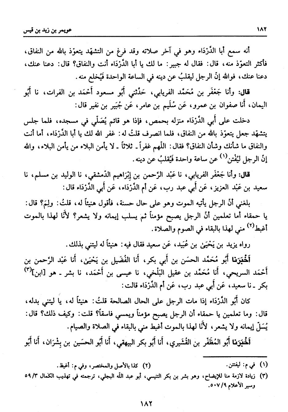 أنه سمع أبا الدرداء وهو في آخر صلاته وقد فرغ من التشهد يتعوذ بالله من النفاق فأكثر التفوذ منه قال فقال له جبير ما لك يا أبا الدرداء أنت والنفاق قال دعنا عنك دعنا عنك فوالله إن الرجل ليقلب عن دينه في الساعة الواحدة فيخلع منه قال وأنا جعفر بن محمد الفريابي حدثني أبو مسعود أحمد بن الفرات نا أبو اليمان أنا صفوان بن عمرو عن سليم بن عامر عن جبير بن نفير قال دخلت على أبي الدرداء منزله بحمص فإذا هو قائم يصلي في مسجده فلما جلس يتشهد جعل يتعوذ بالله من النفاق فلما انصرف قلت له غفر الله لك يا أبا الدرداء أما أنت والنفاق ما شأنك وشأن النفاق فقال اللهم غفرا ثلاثا لا يأمن البلاء من يأمن البلاء والله إن الرجل ليفتن عن ساعة واحدة فيقلب عن دينه قال وأنا جعفر الفريابي نا عبد الرحمن بن إبراهيم الدمشقي نا الوليد بن مسلم نا سعيد بن عبد العزيز عن أبي عبد رب عن أم الدرداء عن أبي الدرداء قال بلغني أن الرجل يأتيه الموت وهو على حال حسنة فأقول هنيئا له قلت ولم قال يا حمقاء أما تعلمين أن الرجل يصبح مؤمنا ثم يسلب إيمانه ولا يشعر لأنا لهذا بالموت أغبط مني لهذا بالبقاء في الصوم والصلاة رواه يزيد بن يحيى بن عبيد عن سعيد فقال فيه هنيئا له ليتني بذلك أخبرنا أبو محمد الحسن بن أبي بكر أنا الفضيل بن يحيى أنا عبد الرحمن بن أحمد السريحي أنا محمد بن عقيل البلخي نا عيسى بن أحمد نا بشر هو ابن بكر نا سعيد عن أبي عبد رب عن أم الدرداء قالت كان أبو الدرداء إذا مات الرجل على الحال الصالحة قلت هنيئا له يا ليتني بدله قال وما تعلمين يا حمقاء أن الرجل يصبح مؤمنا ويمسي فاسقا قلت وكيف ذلك قال يسل إيمانه ولا يشعر لأنا لهذا بالموت أغبط مني بالبقاء في الصلاة والصيام أخبرنا أبو المظفر بن القشيري أنا أبو بكر البيهقي أنا أبو الحسين بن بشران أنا أبو