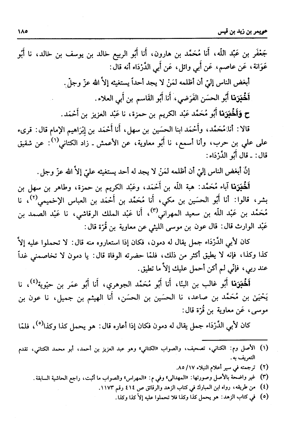 جعفر بن عبد الله أنا محمد بن هارون أنا أبو الربيع خالد بن يوسف بن خالد نا أبو عوانة عن عاصم عن أبي وائل عن أبي الدرداء أنه قال ابغض الناس ألي أن أظلمه لمن لا يجد أحدا يستغيثه إلا الله عزوجل أخبرنا أبو الحسن الفرضي أنا أبو القاسم بن أبي العلاء ح وأخبرنا أبو محمد عبد الكريم بن حمزة نا عبد العزيز بن أحمد قالا أنا محمد وأحمد ابنا الحسين بن سهل أنا أحمد بن إبراهيم الإمام قال قرئ على علي بن حرب وأنا أسمع نا أبو معاوية عن الأعمش زاد الكتاني عن شقيق قال قال أبو الدرداء إن أبغض الناس إلي أن أظلمه لمن لا يجد له أحد يستغيثه علي إلا الله عزوجل أخبرنا آباء محمد هبة الله بن أحمد وعبد الكريم بن حمزة وطاهر بن سهل بن بشر قالوا أنا أبو الحسين بن مكي أنا محمد بن أحمد بن العباس الإخميمي نا محمد بن عبد الله بن سعيد المهراني أنا عبد الملك الرقاشي نا عبد الصمد بن عبد الوارث قال قال عون بن موسى الليثي عن معاوية بن قرة قال كان لأبي الدرداء جمل يقال له دمون فكان إذا استعاروه منه قال لا تحملوا عليه إلا كذا وكذا فإنه لا يطيق أكثر من ذلك فلما حضرته الوفاة قال يا دمون لا تخاصمني غدا عند ربي فإني لم أكن أحمل عليك إلا ما تطيق أخبرنا أبو غالب بن البنا أنا أبو محمد الجوهري أنا أبو عمر بن حيوية نا يحيى بن محمد بن صاعد نا الحسين بن الحسن أنا الهيثم بن جميل نا عون بن موسى عن معاوية بن قرة قال كان لأبي الدرداء جمل يقول له دمون فكان إذا أعاره قال هو يحمل كذاوكذا فلما
