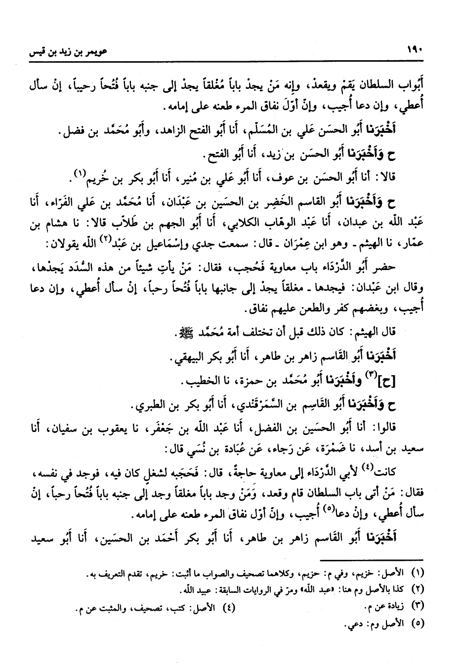 1 - الاصل: خزيم وفي م: حزيم وكلاهما تصحيف والصواب ما اثبت خريم تقدم التعريف به 2 - كذا بالاصل وم هنا: عبد الله ومر في الروايات السابقة: عبيد الله
