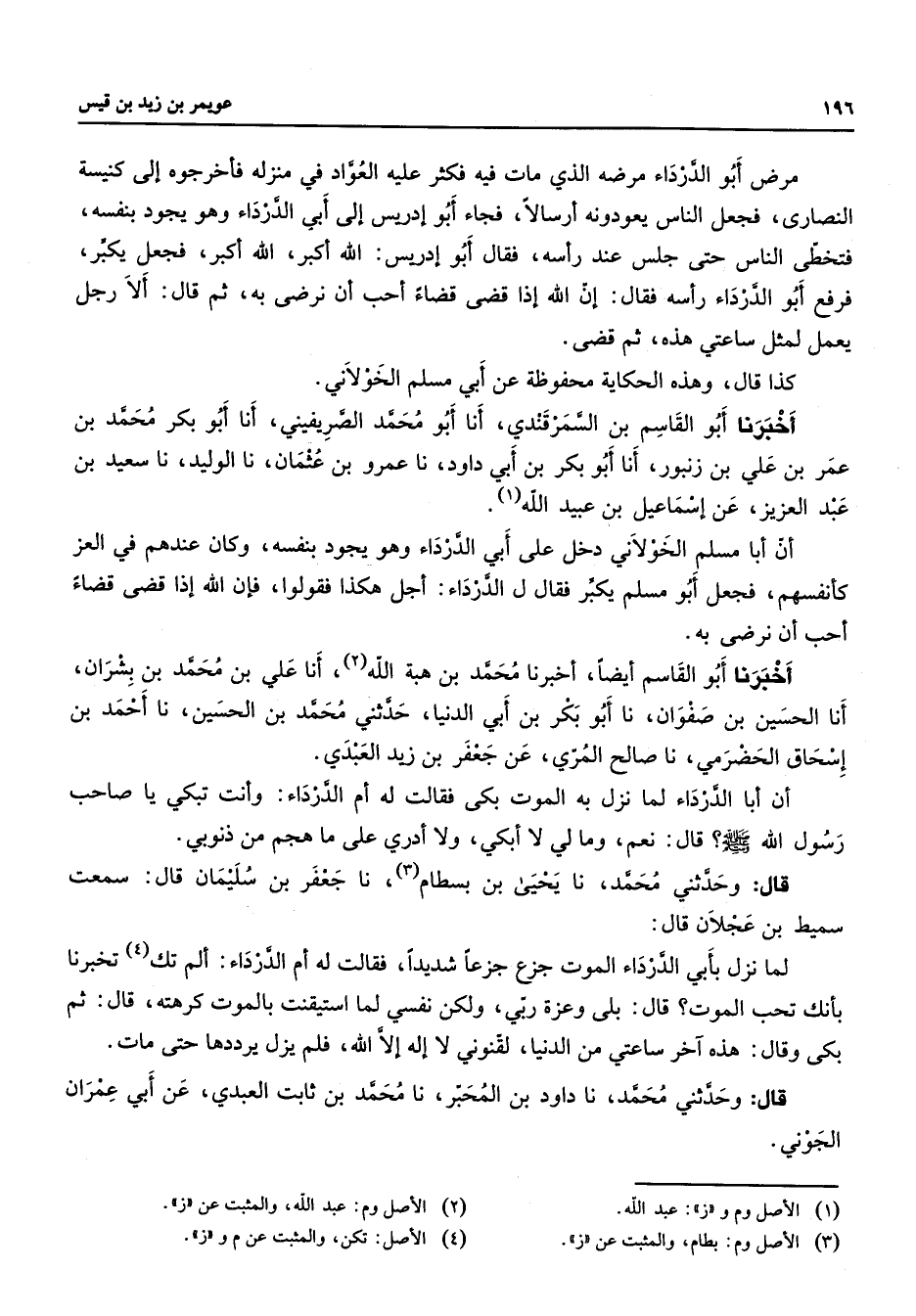 كذا قال وهذه الحكاية محفوظة عن أبي مسلم الخولاني أخبرنا أبو القاسم بن السمرقندي أنا أبو محمد الصريفيني أنا أبو بكر محمد بن عمر بن علي بن زنبور أنا أبو بكر بن أبي داود نا عمرو بن عثمان نا الوليد نا سعيد بن عبد العزيز عن إسماعيل بن عبيد الله أن أبا مسلم الخولاني دخل على أبي الدرداء وهو يجود بنفسه وكان عندهم في العز كأنفسهم فجعل أبو مسلم يكبر فقال ل الدرداء أجل هكذا فقولوا فإن الله إذا قضى قضاء أحب أن نرضى به أخبرنا أبو القاسم أيضا أخبرنا محمد بن هبة الله أنا علي بن محمد بن بشران أنا الحسين بن صفوان نا أبو بكر بن أبي الدنيا حدثني محمد بن الحسين نا أحمد بن إسحاق الحضرمي نا صالح المري عن جعفر بن زيد العبدي أن أبا الدرداء لما نزل به الموت بكى فقالت له أم الدرداء وأنت تبكي يا صاحب رسول الله (صلى الله عليه وسلم) قال نعم ومالي لا أبكي ولا أدري على ما هجم من ذنوبي قال وحدثني محمد نا يحيى بن بسطام نا جعفر بن سليمان قال سمعت سميط بن عجلان قال لما نزل بأبي الدرداء الموت جزع جزعا شديدا فقالت له أم الدرداء ألم تك تخبرنا بأنك تحب الموت قال بلى وعزة ربي ولكن نفسي لما استيقنت بالموت كرهته قال ثم بكى وقال هذه آخر ساعتي من الدنيا لقنوني لا إله إلا الله فلم يزل يرددها حتى مات قال وحدثني محمد نا داود بن المحبر نا محمد بن ثابت العبدي عن أبي عمران الجوني