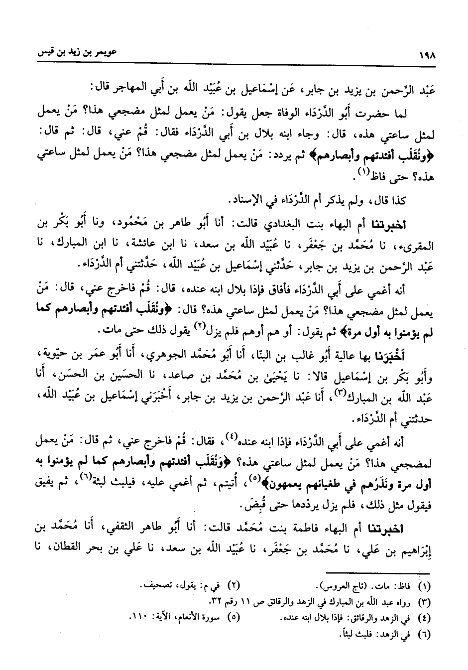 عبد الرحمن بن يزيد بن جابر عن إسماعيل بن عبيد الله بن أبي المهاجر قال لما حضرت أبو الدرداء الوفاة جعل يقول من يعمل لمثل مضجعي هذا من يعمل لمثل ساعتي هذه قال وجاء ابنه بلال بن أبي الدرداء فقال قم عني قال ثم قال " ونقلب أفئدتهم وأبصارهم " ثم يردد من يعمل لمثل مضجعي هذا من يعمل لمثل ساعتي هذه حتى فاظ كذا قال ولم يذكر أم الدرداء في الإسناد أخبرتنا أم البهاء بنت البغدادي قالت أنا أبو طاهر بن محمود ونا أبو بكر بن المقرئ نا محمد بن جعفر نا عبيد الله بن سعد نا ابن عائشة نا ابن المبارك نا عبد الرحمن بن يزيد بن جابر حدثني إسماعيل بن عبيد الله حدثتني أم الدرداء أنه أغمي على أبي الدرداء فأفاق فإذا بلال ابنه عنده قال قم فاخرج عني قال من يعمل لمثل مضجعي هذا من يعمل لمثل ساعتي هذه قال " ونقلب أفئدتهم وأبصارهم كما لم يؤمنوا به أول مرة " ثم يقول أو هم أو هم فلم يزل يقول ذلك حتى مات أخبرنا بها عالية أبو غالب بن البنا أنا أبو محمد الجوهري أنا أبو عمر بن حيوية وأبو بكر بن إسماعيل قالا نا يحيى بن محمد بن صاعد نا الحسين بن الحسن أنا عبد الله بن المبارك أنا عبد الرحمن بن يزيد بن جابر أخبرني إسماعيل بن عبيد الله حدثتني أم الدرداء أنه أغمي على أبي الدرداء فإذا ابنه عنده فقال قم فاخرج عني ثم قال من يعمل لمضجعي هذا من يعمل لمثل ساعتي هذه " ونقلب أفئدتهم وأبصارهم كما لم يؤمنوا به أول مرة ونذرهم في طغيانهم يعمهون " أتيتم ثم أغمي عليه فيلبث لبثة ثم يفيق فيقول مثل ذلك فلم يزل يرددها حتى قبض أخبرتنا أم البهاء فاطمة بنت محمد قالت أنا أبو طاهر النقفي أنا محمد بن إبراهيم بن علي نا محمد بن جعفر نا عبيد الله بن سعد نا علي بن بحر القطان نا