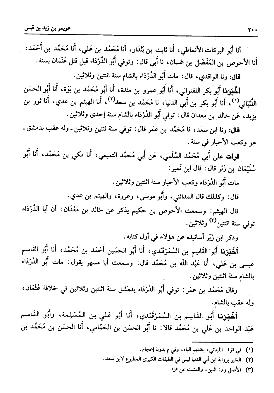 أنا أبو البركانت الأنماطي أنا ثابت بن بندار أنا محمد بن علي أنا محمد بن أحمد أنا الأحوص بن المفضل بن غسان نا أبي قال وتوفي أبو الدرداء قبل قتل عثمان بسنة قال ونا الواقدي قال مات أبو الدرداء بالشام سنة اثنتين وثلاثين أخبرنا أبو بكر اللفتواني أنا أبو عمرو بن مندة أنا أبو محمد بن يوة أنا أبو الحسن اللنباني أنا أبو بكر بن أبي الدنيا نا محمد بن سعد أنا الهيثم بن عدي أنا ثور بن يزيد عن خالد بن معدان قال توفي أبو الدرداء بالشام سنة إحدى وثلاثين قال ونا ابن سعد نا محمد بن عمر قال توفي سنة ثنتين وثلاثين وله عقب بدمشق هو وكعب الحبار في سنة قرأت على أبي محمد السلمي عن أبي محمد التميمي أنا مكي بن محمد أنا أبو سليمان بن زبر قال قال ابن نمير مات أبو الدرداء وكعب الأحبار سنة اثنتين وثلاثين قال وكذلك قال المدائني وأبو موسى وعروة والهيثم بن عدي قال الهيثم وسمعت الأحوص بن حكيم يذكر عن خالد بن معدان أن أبا الدرداء توفي سنة اثنتين وثلاثين وذكر ابن زبر أسانيده عن هؤلاء في أول كتابه أخبرنا أبو القاسم بن السمرقندي أنا أبو الحسين أحمد بن محمد أنا أبو القاسم عيسى بن علي أنا عبد الله بن محمد قال وسمعت أبا مسهر يقول مات أبو الدرداء بالشام سنة اثنتين وثلاثين وقال محمد بن عمر توفي أبو الدرداء بدمشق سنة اثنتين وثلاثين في خلافة عثمان وله عقب بالشام أخبرنا أبو القاسم بن السمرقندي أنا أبو علي بن المسلمة وابو القاسم عبد الواحد بن علي بن محمد قالا نا أبو الحسن بن الحمامي أنا الحسن بن محمد بن