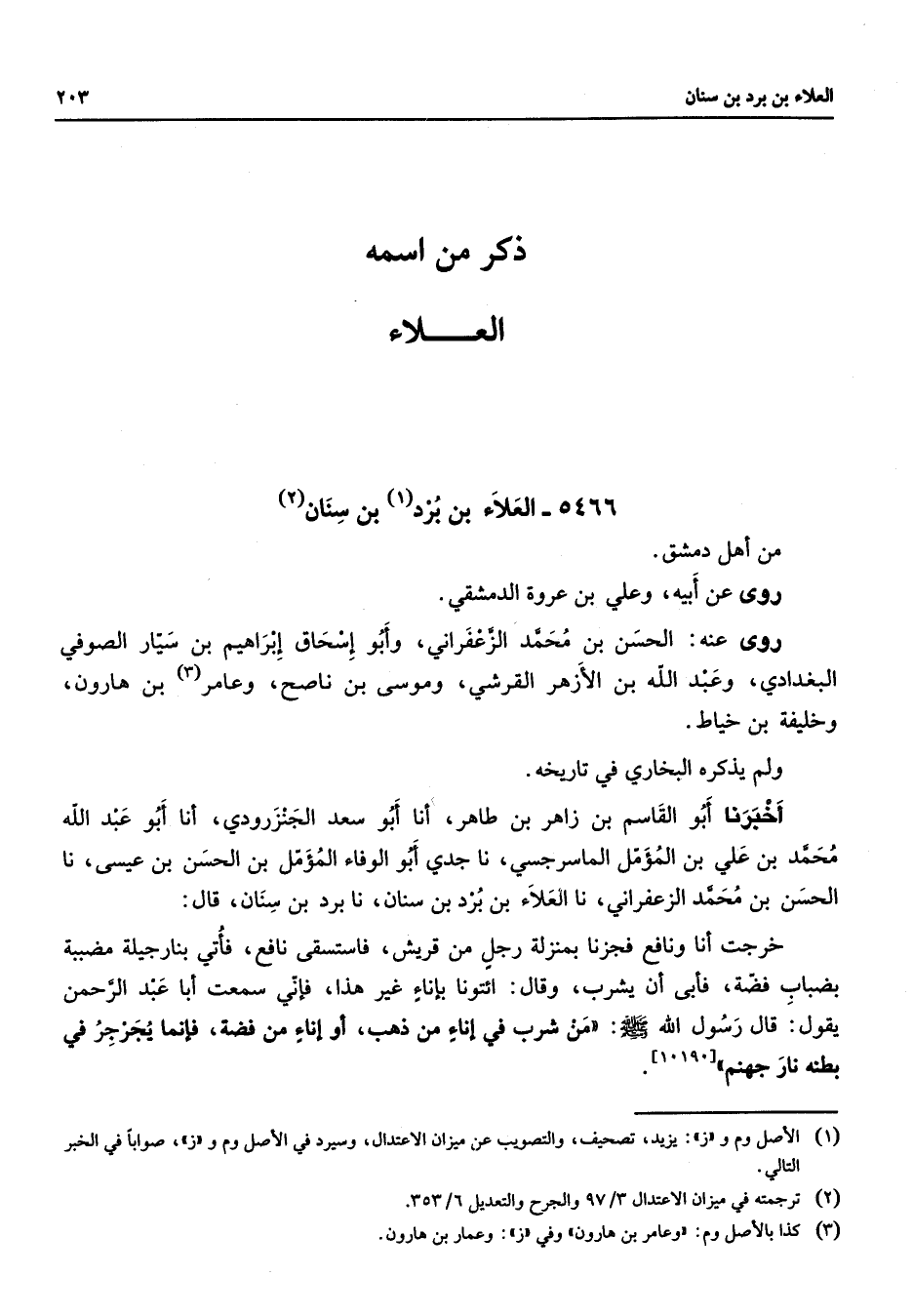 5466 - العلاء بن برد بن سنان من أهل دمشق روى عن أبيه وعلي بن عروة الدمشقي روى عنه الحسن بن محمد الزعفراني وأبو إسحاق إبراهيم بن سيار الصوفي البغدادي وعبد الله بن الأزهر القرشي وموسى بن ناصح وعامر بن هارون وخليفة بن خياط ولم يذكره البخاري في تاريخه أخبرنا أبو القاسم بن زاهر بن طاهر أنا أبو سعد الجنزرودي أنا أبو عبد الله محمد بن علي بن المؤمل الماسرجسي نا جدي أبو الوفاء المؤمل بن الحسن بن عيسى نا الحسن بن محمد الزعفراني نا العلاء بن برد بن سنان نا برد بن سنان قال خرجت أنا ونافع فجزنا بمنزلة رجل من قريش فاستسقى نافع فأتي بنار جيلة مضببة بضباب فضة فأبى أن يشرب وقال ائتونا بإناء غير هذا فإني سمعت أبا عبد الرحمن يقول قال رسول الله (صلى الله عليه وسلم) من شرب في إناء من ذهب أو إناء من فضة فإنما يجرجر في بطنه نار جهنم