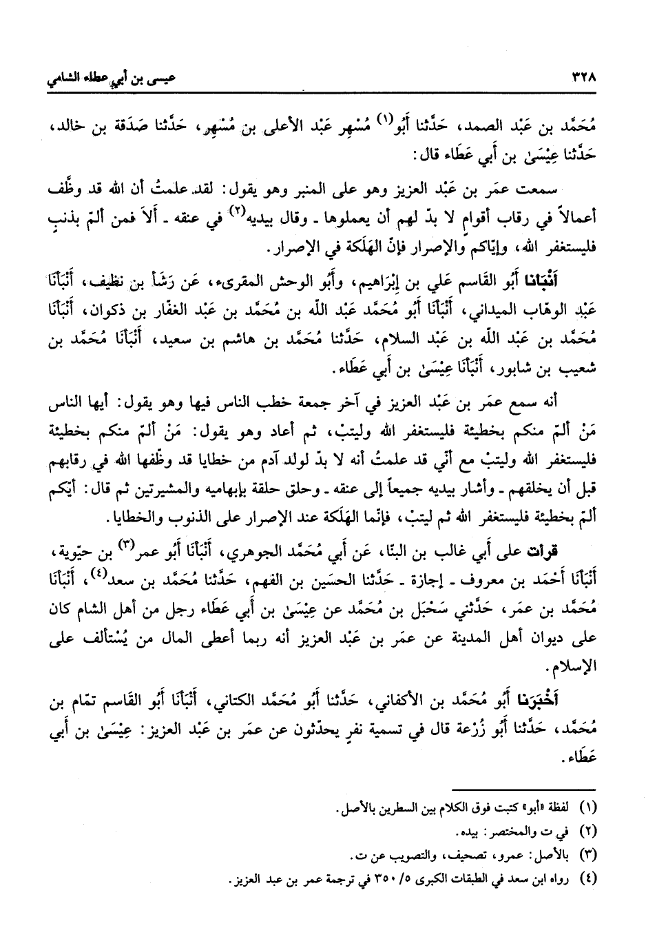 محمد بن عبد الصمد حدثنا أبو مسهر عبد الاعلى بن مسهر حدثنا صدقة بن خالد حدثنا عيسى بن ابي عطاء قال سمعت عمر بن عبد العزيز وهو على المنبر وهو يقول لقد علمت ان الله قد وظف اعمالا في رقاب اقوام لا بد لهم ان يعملوها وقال بيديه في عنقه الا فمن الم بذنب فليستغفر الله واياكم والاصرار فان الهلكة في الاصرار انبأنا أبو القاسم علي بن ابراهيم وابو الوحش المقرئ عن رشأ بن نظيف أنبأنا عبد الوهاب الميداني انبأنا أبو محمد عبد الله بن محمد بن عبد الغفار بن ذكوان انبأنا محمد بن عبد الله بن عبد السلام حدثنا محمد بن هاشم بن سعيد انبأنا محمد بن شعيب بن شابور انبأنا عيسى بن ابي عطاء انه سمع عمر بن عبد العزيز في آخر جمعة خطب الناس فيها وهو يقول ايها النس من الم منكم بخطيئة فليستغفر الله وليتب ثم اعاد وهو يقول من الم منكم بخطيئة فليستغفر الله وليتب مع اني قد علمت انه لا بد لولد ادم من خطايا قد وظفها الله في رقابهم قبل ان يخلقهم واشار بيديه جميعا الى عنقه وحلق حلقة بابهاميه والمشيرتين ثم قال ايكم الم بخطيئة فليستغفر الله ثم ليتب فانما الهلكة عند الاصرار على الذنوب والخطايا قرأت على ابي غالب بن البنا عن ابي محمد الجوهري أنبأنا أبو عمر بن حيوية أنبأنا احمد بن معروف اجازة حدثنا الحسين بن الفهم حدثنا محمد بن سعد انبأنا محمد بن عمر حدثني سحبل بن محمد عن عيسى بن ابي عطاء رجل من اهل الشام كان على ديوان اهل المدينة عن عمر بن عبد العزيز انه ربما اعطى المال من يستألف على الاسلام اخبرنا أبو محمد بن الاكفاني حدثنا أبو محمد الكتاني انبأنا أبو القاسم تمام بن محمد حدثنا أبو زرعة قال في تسمية نفر يحدثون عن عمر بن عبد العزيز عيسى بن ابي عطاء