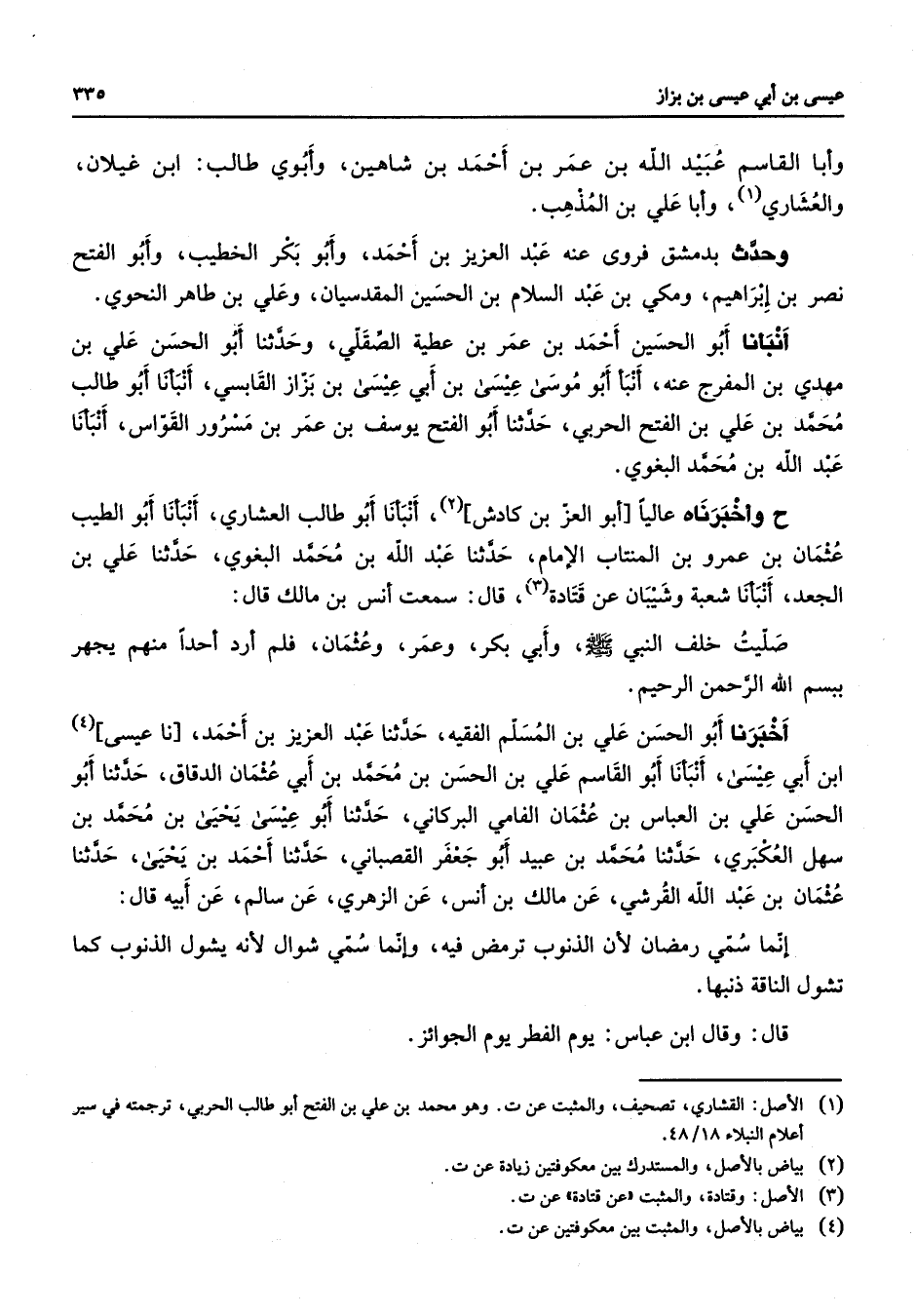 وأبا القاسم عبيد الله بن عمر بن احمد بن شاهين وابوي طالب ابن غيلان والعشاري وابا علي بن المذهب وحدث بدمشق فروى عنه عبد العزيز بن احمد وابو بكر الخطيب وابو الفتح نصر بن ابراهيم ومكي بن عبد السلام بن الحسين المقدسيان وعلي بن طاهر النحوي انبأنا أبو الحسين احمد بن عمر بن عطية الصقلي وحدثنا أبو الحسن علي بن مهدي بن المفرج عنه انبأ أبو موسى عيسى بن ابي عيسى بن بزاز القابسي انبأنا أبو طالب محمد بن علي بن الفتح الحربي حدثنا أبو الفتح يوسف بن عمر بن مسرور القواس انبأنا عبد الله محمد البغوي ح واخبرناه عاليا أبو العز بن كادش انبأنا أبو طالب العشاري انبأنا أبو الطيب عثمان بن عمرو بن المنتاب الامام حدثنا عبد الله بن محمد البغوي حدثنا علي بن الجعد أنبأنا شعبة وشيبان عن قتادة قال سمعت انس بن مالك قال صليت خلف النبي (صلى الله عليه وسلم) وابي بكر وعمر وعثمان فلم ارد احدا منهم يجهر بسم الله الرحمن الرحيم اخبرنا أبو الحسن علي بن المسلم الفقيه حدثنا عبد العزيز بن احمد نا عيسى ابن ابي عيسى انبأنا أبو القاسم علي بن الحسن بن محمد بن ابي عثمان الدقاق حدثنا أبو الحسن علي بن العباس بن عثمان الفامي البركاني حدثنا أبو عيسى يحيى بن محمد بن سهل العكبري حدثنا محمد بن عبيد أبو جعفر القصباني حدثنا احمد بن يحيى حدثنا عثمان بن عبد الله القرشي عن مالك بن انس عن الزهري عن سالم عن ابيه قال انما سمي رمضان لان الذنوب ترمض فيه وانما سمي شوال لانه يشول الذنوب كما تشول الناقة ذنبها قال وقال ابن عباس يوم الفطر يوم الجوائز