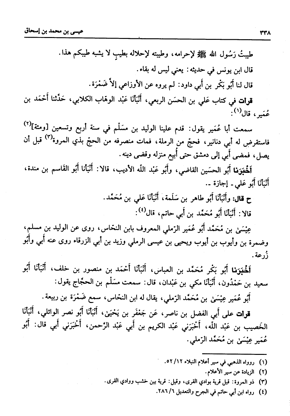 طيبت رسول الله (صلى الله عليه وسلم) لاحرامه وطيبته لاحلاله بطيب لا يشبه طيبكم هذا قال ابن يونس في حديثه يعني ليس له بقاء قال لنا أبو بكر بن ابي داود لم يروه عن الاوزاعي الا ضمرة قرأت في كتاب علي بن الحسن الربعي انبأنا عبد الوهاب الكلابي حدثنا احمد بن عمير قال سمعت ابا عمير يقول قدم علينا الوليد بن مسلم في سنة اربع وتسعين ومئة فاستقرض له ابي دنانير فحج من الرملة فمات منصرفه من الحج بذي المروة قبل ان يصل فمضى ابي الى دمشق حتى ابيع منزله وقضى دينه اخبرنا أبو الحسين القاضي وابو عبد الله الاديب قالا انبأنا أبو القاسم بن مندة انبأنا أبو علي اجازة ح قال وانبأنا أبو طاهر بن سلمة انبأنا علي بن محمد قالا انبأنا أبو محمد بن ابي حاتم قال عيسى بن محمد أبو عمير الرملي المعروف بابن النحاس روى عن الوليد بن مسلم وضمرة بن وايوب بن ايوب ويحيى بن عيسى الرملي وزيد بن ابي الزرقاء روى عنه ابي وابو زرعة اخبرنا أبو بكر محمد بن العباس انبانا احمد بن منصور بن خلف انبأنا أبو سعيد بن حمدون انبأنا مكي بن عبدان قال سمعت مسلم بن الحجاج يقول أبو عمير عيسى بن محمد الرملي يقال له ابن النحاس سمع ضمرة بن ربيعة قرأت على ابي الفضل بن ناصر عن جعفر بن يحيى انبأنا أبو نصر الوائلي انبأنا الخصيب بن عبد الله اخبرني عبد الكريم بن ابي عبد الرحمن اخبرني ابي قال أبو عمير عيسى بن محمد الرملي