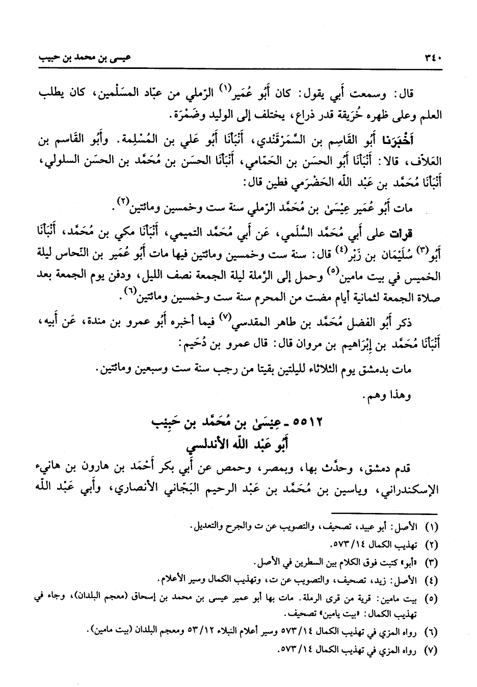 5512 - عيسى بن محمد بن حبيب أبو عبد الله الاندلسي قدم دمشق وحدث بها وبمصر وحمص عن ابي بكر احمد بن هارون بن هانئ الاسكندراني وياسين بن محمد بن عبد الرحيم البجاني الانصاري وابي عبد الله