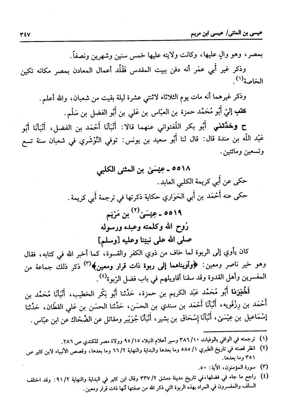 5519 - عيسى بن مريم روح الله وكلمته وعبده ورسوله صلى الله على نبينا وعليه وسلم كان يأوي الى الربوة لما خاف من ذوي الكفر والقسوة كما اخبر الله في كتابه فقال وهو خير ناصر ومعين " وآويناهما الى ربوة ذات قرار ومعين " ذكر ذلك جماعة من المفسرين واهل القدوة وقد سقنا اقاويلهم في باب فضل الربوة اخبرنا أبو محمد عبد الكريم بن حمزة حدثنا أبو بكر الخطيب انبأنا محمد بن احمد بن رزقويه انبأنا احمد بن سندي بن الحسن حدثنا الحسن بن علي القطان حدثنا اسماعيل بن عيسى انبأنا اسحاق بن بشير انبأنا جويبر ومقاتل عن الضحاك عن ابن عباس * (هامشش) * 1 - ترجمته في الوافي بالوافيات 10 / 386 وسير اعلام النبلاء 15 / 95 وولاء مصر للكندي 286