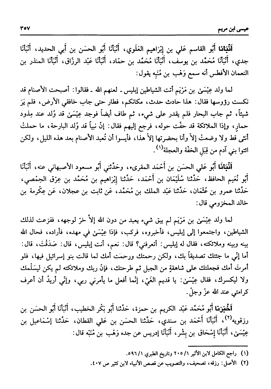 انبأنا أبو القاسم علي بن ابراهيم العلوي انبأنا أبو الحسن بن ابي الحديد انبأنا جدي انبأنا محمد بن يوسف انبأنا محمد بن حماد انبأنا عبد الرزاق انبأنا المنذر بن النعمان الافطس انه سمع وهب بن منبه يقول لما ولد عيسى بن مريم اتت الشياطين ابليس لعنهم الله فقالوا اصبحت الاصنام قد نكست رؤوسها فقال هذا حادث حدث مكانكم فطار حتى جاب خافقي الارض فلم ير شيئا ثم جاب البحار فلم يقدر على شئ ثم طاف ايضا فوجد عيسى قد ولد عند مذود حمارواذا الملائكة قد حفت حوله فرجع إليهم فقال ان نبيا قد ولد البارحة ما حملت انثى قط ولا وضعت الا وانا بحضرتها الا هذا فأيسوا ان تعبد الأصنام بعد هذه الليل ولكن ائتوا بني آدم من قبل الخفة والعجلة أنبأنا أبو علي الحسن بن احمد المقرئ وحدثني أبو مسعود الاصبهاني عنه انبأنا أبو نعيم الحافظ حدثنا سليمان بن احمد حدثنا ابراهيم بن محمد بن عرق الحمصي حدثنا عمرو بن عثمان حدثنا عبد الملك بن محمد عن ثابت بن عجلان عن عكرمة بن خالد المخزومي قال لما ولد عيسى بن مريم لم يبق شئ يعبد من دون الله الا خر لوجهه ففزعت لذلك الشياطين واجتمعوا الى ابليس فأخبروه فركب فإذا عيسى في مهده فاراده فحال الله بينه وبينه وملائكته فقال له ابليس اتعرفني قال نعم انت ابليس قال صدقت قال اما اني ما جئتك تصديقا بك ولكن رحمتك ورحمت امك لما قالت بنو اسرائيل فيها فلو امرت امك فجعلتك على شاهقة من الجبل ثم طرحتك فإن ربك وملائكته لم يكن ليسلمك ولا ليكسرك فقال عيسى يا قديم انما افعل ما يأمرني ربي واني اريد ان اعرف كرامتي عند الله عزوجل اخبرنا أبو محمد عبد الكريم بن حمزة حدثنا أبو بكر الخطيب انبأنا أبو الحسن بن رزقويه انبأنا احمد بن سندي حدثنا الحسن بن علي القطان حدثنا اسماعيل بن عيسى انبأنا اسحاق بن بشر انبأنا ادريس عن جده وهب بن منبه قال