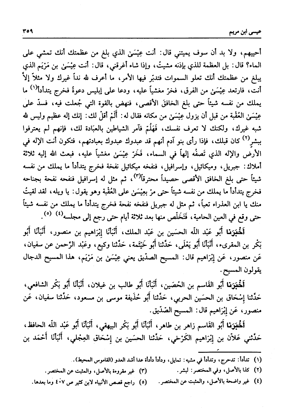 احييهم ولا بد ان سوف يميتني قال انت عيسى الذي بلغ من عظمتك انك تمشي على الماء قال بل العظمة للذي بإذنه مشيت وإذا شاء اغرقني قال انت عيسى بن مريم الذ يبلغ من عظمتك انك تعلو السموات فتدبر فيها الامر ما اعرف لله ندا غيرك ولا مثلا الا انت فارتعد عيسى من الفرق فخر مغشيا عليه ودعا على ابليس دعوة فخرج يتدأدأ ما يملك من نفسه شيئا حتى بلغ الخافق الأقصى فنهض بالقوة التي جعلت فيه فسد على شبه عيسى العقبة من قبل أن يزول عيسى من مكانه فقال له ألم أقل لك إنك إله عظيم وليس لله شبه غيرك ولكنك لا تعرف نفسك فهلم فأمر الشياطين بالعبادة لك فإنهم لم يعترفوا ببشر كان قبلك فإذا رأى بنو آدم انهم قد عبدوك عبدوك بعبادتهم فتكون انت الاله في الارض والاله الذي تصفه الها في السماء فخر عيسى مغشيا عليه فبعث الله إليه ثلاثة املاك جبريل وميكائيل واسرافيل فنفخه نفخة فخرج يتدأدأ ما يملك من نفسه شيئا حتى بلغ الخافق الاقصى حصيدا محترقا ثن مثل له اسرافيل فنفخه نفخة بجناحه فخرج يتدأدأ ما يملك من نفسه شيئا حتى مر بعيسى على العقبة وهو يقول يا ويله لقد لقيت منك ابن العذراء تعبا ثم مثل له جبريل فنفخه نفخة مخرج يتدأدأ ما يملك من نفسه شيئا حتى وقع في العين الحامية فتخلص منها بعد ثلاثة ايام حتى رجع الى مجلسه اخبرنا أبو عبد الله الحسين بن عبد الملك انبأنا ابراهيم بن منصور انبأنا أبو بكربن المقرئ انبأنا أبو يعلى حدثنا أبو خيثمة حدثنا وكيع وعبد الرحمن عن سفيان عن منصور عن ابراهيم قال المسيح الصديق يعني عيسى بن مريم هذا المسيح الدجال يقولون المسيح اخبرنا أبو القاسم بن الحصين انبأنا أبو طالب بن غيلان انبأنا أبو بكر الشافعي حدثنا إسحاق بن الحسين الحربي حدثنا أبو حذيفة موسى بن مسعود حدثنا سفيان عن منصور عن ابراهيم قال المسيح الصديق اخبرنا أبو القاسم زاهر بن طاهر انبأنا أبو بكر البيهقي انبأنا أبو عبد الله الحافظ حدثني علان بن ابراهيم الكرخي حدثنا الحسين بن اسحاق العجلي انبأنا احمد بن