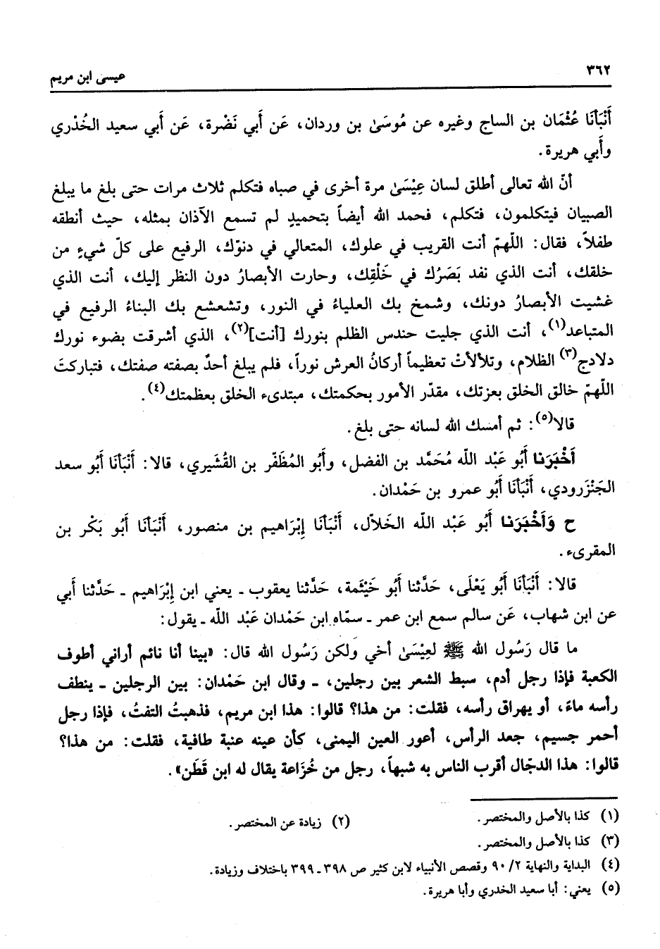 انبأنا عثمان بن الساج وغيره عن موسى بن وردان عن ابي نضرة عن ابي سعيد الخدري وابي هريرة ان الله تعالى اطلق لسان عيسى مرة اخرى في صباه فتكلم ثلاث مرات حتى بلغ ما يبلغ الصبيان فيتكلمون فتكلم فحمد الله أيضا بتحميد لم تسمع الآذان بمثله حيث أنطقه طفلا فقال اللهم انت القريب في علوك والمتعالي في دنوك الرفيع على كل شئ من خلقك انت الذي نفذ بصرك في خلقك وحارت الابصار دون النظر اليك انت الذي غشيت الابصار دونك وشمخ بك العلياء في النور وتشعشع بك البناء الرفيع في المتباعد انت الذي جليت حندس الظلم بنورك انت الذي اشرقت بضوء نورك دلادج الظلام وتلألأت تعظيما اركان العرش نورا فلم يبلغ احد بصفته صفتك فتباركت اللهم خالق الخلق بعزتك مقدر الامور بحكمتك مبتدئ الخلق بعظمتك قالا ثم امسك الله لسانه حتى بلغ اخبرنا أبو عبد الله محمد بن الفضل وابو المظفر بن القشيري قالا انبأنا أبو سعد الجنزوردي انبأنا أبو عمرو بن حمدان ح واخبرنا أبو عبد الله الخلال انبأنا ابراهيم بن منصور انبأنا أبو بكر بن المقرئ قالا أنبأنا أبو يعلى حدثنا أبو خيثمة حدثنا يعقوب يعني ابن ابراهيم حدثنا ابي عن ابن شهاب عن سالم سمع ابن عمر سماه ابن حمدان عبد الله يقول ما قال رسول الله (صلى الله عليه وسلم) لعيسى أخي ولكن رسول الله قال بينا انا نائم اراني اطوف الكعبة فإذا رجل ادم سبط الشعر بين رجلين وقال ابن حمدان بين الرجلين ينطف رأسه ماءاو يهراق رأسه فقلت من هذا قالوا هذا ابن مريم فذهبت التفت فإذا رجل احمر جسيم جعد الرأس اعور العين اليمنى كأن عينه عنبة طافية فقلت من هذا قالوا هذا الدجال اقرب الناس به شبها رجل من خزاعة يقال له ابن قطن