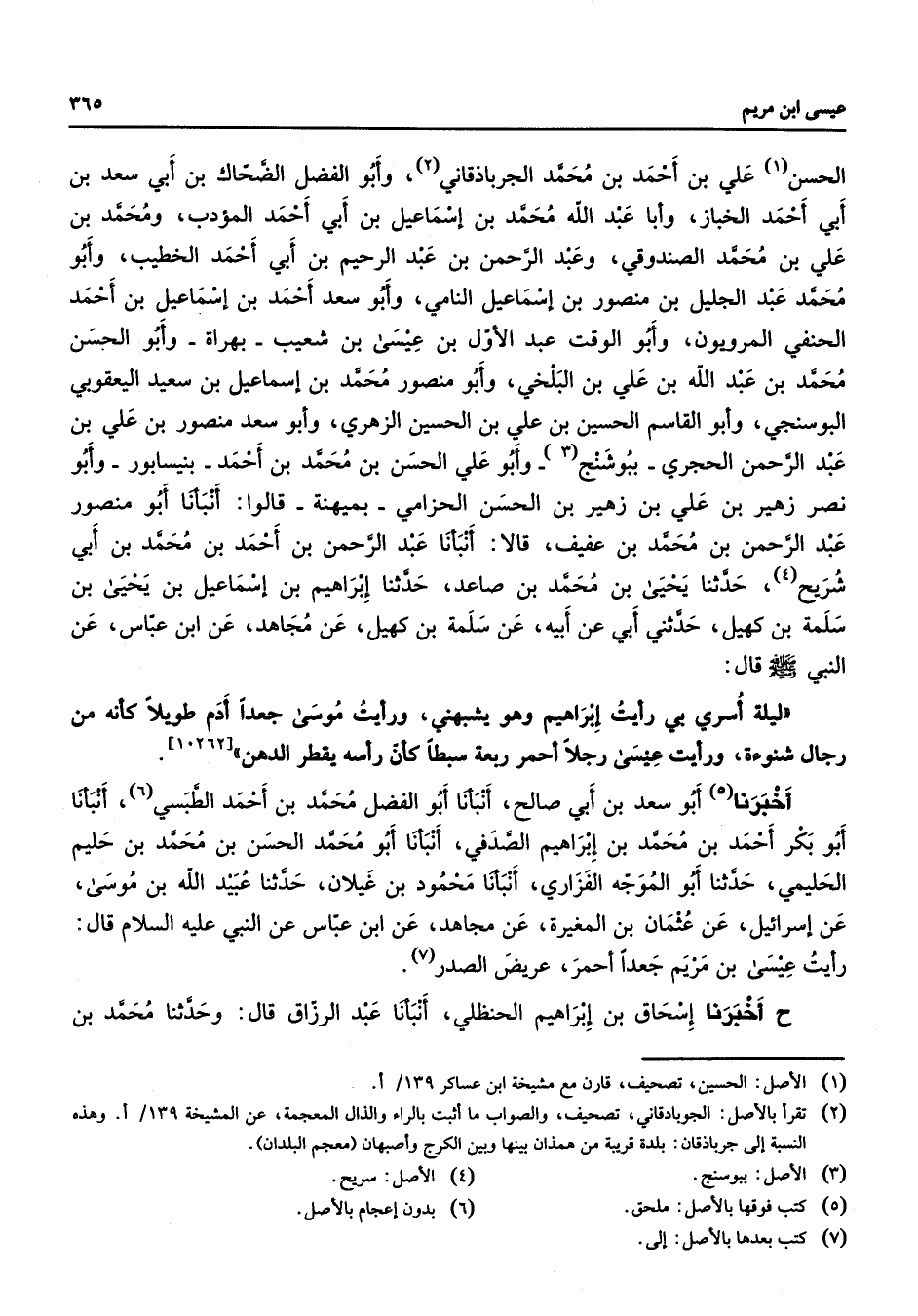 الحسن علي بن احمد بن محمد الجرباذقاني وابو الفضل الضحاك بن ابي سعد بن ابي احمد الخباز وأبا عبد الله محمد بن إسماعيل بن أبي أحمد المؤدب ومحمد بن علي بن محمد الصندوقي وعبد الرحمن بن عبد الرحيم بن ابي احمد الخطيب وابو محمد عبد الجليل بن منصور بن اسماعيل النامي وابو سعد احمد بن اسماعيل بن احمد الحنفي المرويون وابو الوقت عبد الاول بن عيسى بن شعيب بهراة وابو الحسن محمد بن عبد الله بن علي بن البلخي وابو منصور محمد بن اسماعيل بن سعيد اليعقوبي البوسنجي وابو القاسم الحسين بن علي بن الحسين الزهري وابو سعد منصور بن علي بن عبد الرحمن الحجري ببوشنج وابو علي الحسن بن محمد بن احمد بنيسابور وابو نصر زهير بن علي بن زهير بن الحسن الحزامي بميهنة قالوا انبأنا أبو منصور عبد الرحمن بن محمد بن عفيف قالا أنبأنا عبد الرحمن بن احمد بن محمد بن ابي شريح حدثنا يحيى بن محمد بن صاعد حدثنا ابراهيم بن اسماعيل بن يحيى بن سلمة بن كهيل حدثني ابي عن ابيه عن سلمة بن كهيل عن مجاهد عن ابن عباس عن النبي (صلى الله عليه وسلم) قال ليلة اسري بي رأيت ابراهيم وهو يشبهني ورأت موسى جعدا ادم طويلا كأنه من رجال شنوءة ورأيت عيسى رجلا احمر ربعة سبطا كأن رأسه يقطر دهن اخبرنا أبو سعد بن ابي صالح انبأنا أبو الفضل محمد بن احمد الطبسي انبانا أبو بكر احمد بن محمد بن ابراهيم الصدفي انبأنا أبو محمد الحسن بن محمد بن حليم الحليمي حدثنا أبو الموجة الفزاري انبأنا محمود بن غيلان حدثنا عبيد الله بن موسى عن اسرائيل عن عثمان بن المغيرة عن مجاهد عن ابن عباس عن النبي عليه السلام قال رأيت عيسى بن مريم جعدا احمر عريض الصدر ح اخبرنا اسحاق بن ابراهيم الحنظلي انبأنا عبد الرزاق قال وحدثنا محمد بن