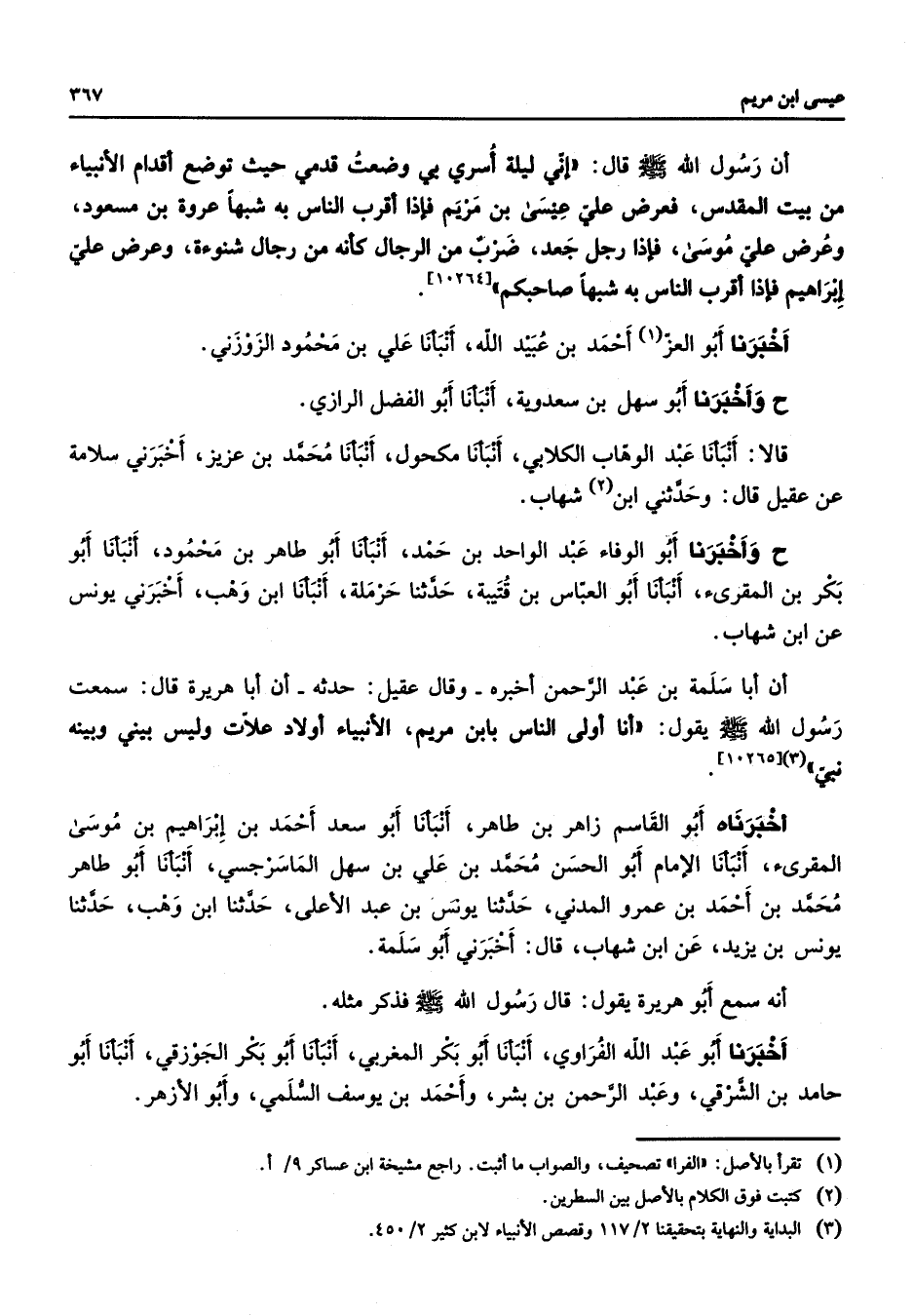 ان رسول الله (صلى الله عليه وسلم) قال اني ليلة اسري بي وضعت قدمي حيث توضع اقدام الانبياء من بيت المقدس فعرض علي عيسى بن مريم فإذا اقرب الناس به شبها عروة بن مسعود وعرض علي موسى فإذا رجل جعد ضرب من الرجال كأنه من رجال شنوءة وعرض علي ابراهيم فإذا اقرب الناس به شبها صاحبكم اخبرنا أبو العز احمد بن عبيد الله انبأنا علي بن محمود الزوزني ح وأخبرنا أبو سهل بن سعدوية أنبأنا أبو الفضل الرازي قالا أنبأنا عبد الوهاب الكلابي انبأنا مكحول انبأنا محمد بن عزيز اخبرني سلامة عن عقيل قال وحدثني ابن شهاب ح واخبرنا أبو الوفاء عبد الواحد بن حمد انبأنا أبو طاهر بن محمود انبأنا أبو بكر بن المقرئ انبأنا أبو العباس بن قتيبة حدثنا حرملة انبأنا ابن وهب اخبرني يونس عن ابن شهاب ان ابا سلمة بن عبد الرحمن اخبره وقال عقيل حدثه ان ابا هريرة قال سمعت رسول الله (صلى الله عليه وسلم) يقول انا اولى الناس بابن مريم الانبياء اولاد علات وليس بيني وبينه نبي اخبرناه أبو القاسم زاهر بن طاهر انبأنا أبو سعد احمد بن ابراهيم بن موسى المقرئ انبأنا الامام أبو الحسن محمد بن علي بن سهل الماسرجسي انبأنا أبو طاهر محمد بن احمد بن عمرو المدني حدثنا يونس بن عبد الاعلى حدثنا ابن وهب حدثنا يونس بن يزيد عن ابن شهاب قال اخبرني أبو سلمة انه سمع أبو هريرة يقول قال رسول الله (صلى الله عليه وسلم) فذكر مثله اخبرنا أبو عبد الله الفراوي انبأنا أبو بكر المغربي انبأنا أبو بكر الجوزقي انبأنا أبو حامد بن الشرقي وعبد الرحمن بن بشر واحمد بن يوسف السلمي وابو الازهر ح واخبرنا ابوا الحسن الفقيهان قالا انبأنا أبو الحسن بن ابي الحديد انبأنا