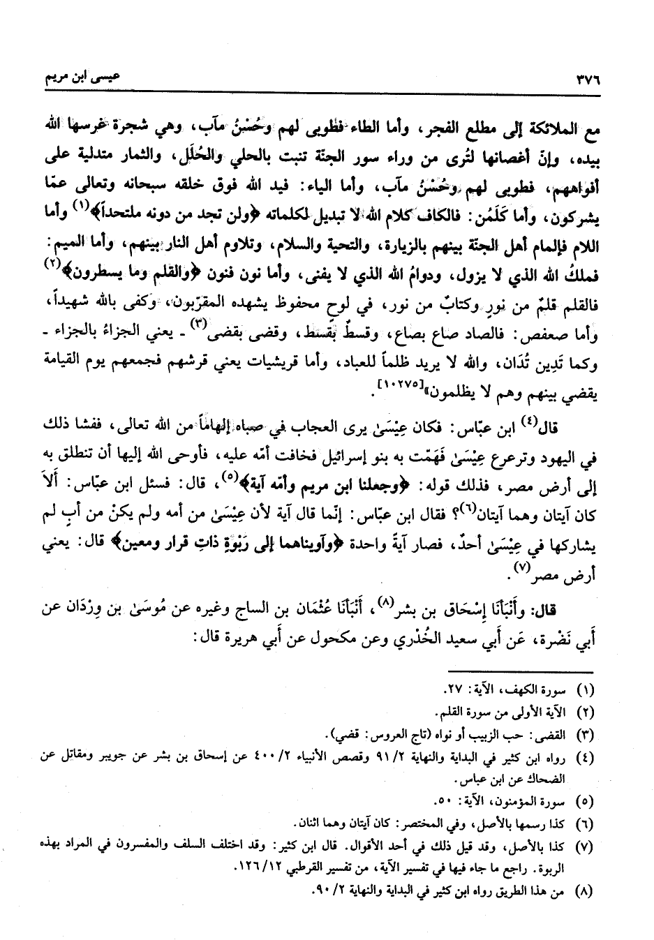6 - كذا رسمها بالاصل وفي المختصر: كان آيتان وهما اثنان 7 - كذا بالاصل وقد قيل ذلك في أحد الاقوال قال ابن كثير: وقد اختلف السلف والمفسرون في المراد بهذه الربوة راجع ما جاء فيها في تفسير الاية من تفسير القرطبي 12 / 126