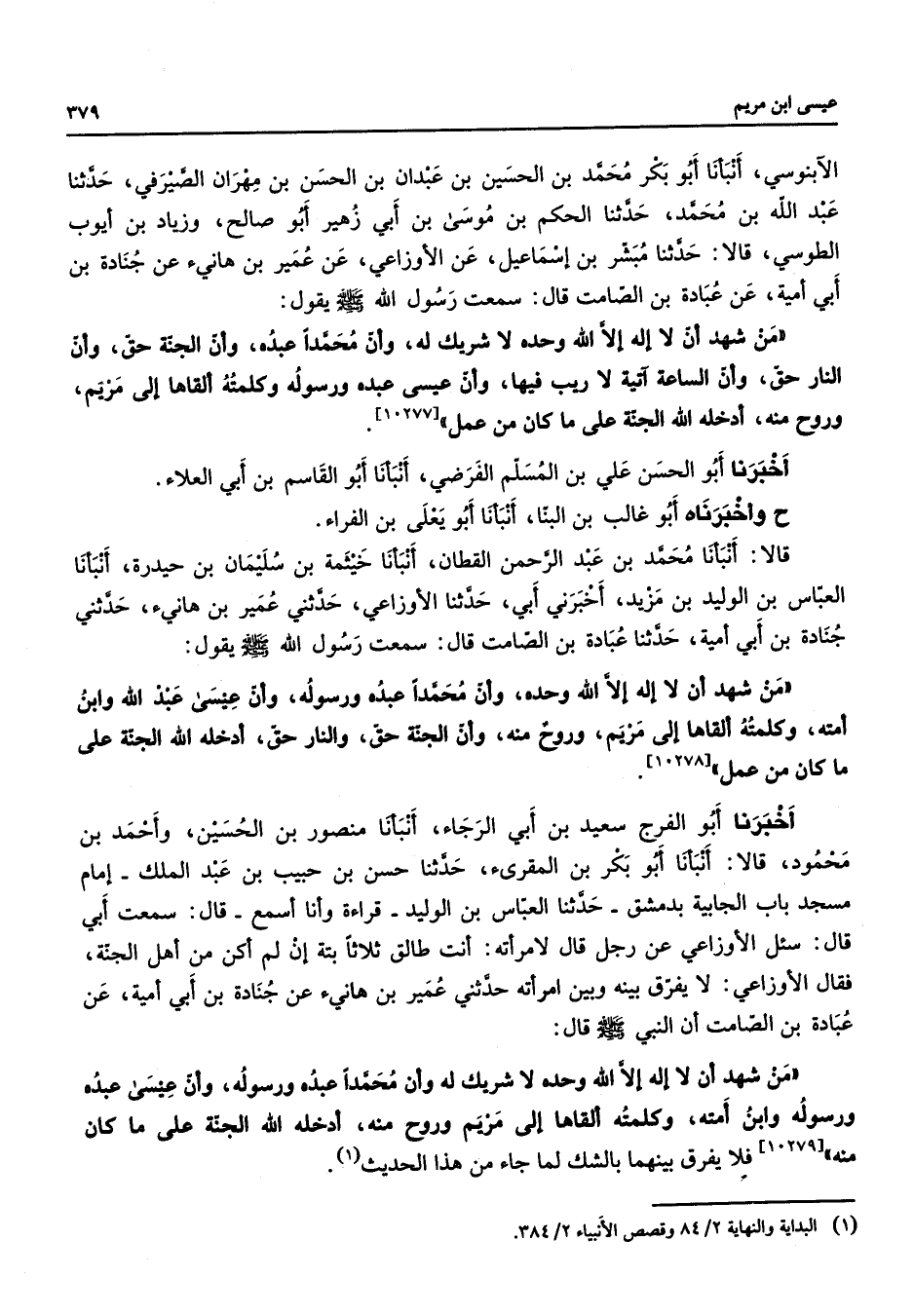 الابنوسي انبأنا أبو بكر محمد بن الحسين بن عبدان بن الحسن بن مهران الصيرفي حدثنا عبد الله بن محمد حدثنا الحكم بن موسى بن ابي زهير أبو صالح وزياد بن ايوب الطوسي قالا حدثنا مبشر بن اسماعيل عن الاوزاعي عن عمير بن هانئ عن جنادة بن ابي امية عن عبادة بن الصامت قال سمعت رسول الله (صلى الله عليه وسلم) يقول من شهد ان لا اله الا الله وحده لا شريك له وان محمدا عبده وان الجنة حق وان النار حق وان الساعة آتية لا ريب فيها وان عيسى عبده ورسوله وكلمته القاها الى مريم وروح منه ادخله الجنة على ما كان من عمل اخبرنا أبو الحسن علي بن المسلم الفرضي انبأنا أبو القاسم بن ابي العلاء ح واخبرناه أبو غالب بن البنا انبأنا أبو يعلى بن الفراء قالا انبأنا محمد بن عبد الرحمن القطان انبأنا خيثمة بن سليمان بن حيدرة اانبأنا العباس بن الوليد بن مزيد اخبرني ابي حدثنا الاوزاعي حدثني عمير بن هانئ حدثني جنادة بن ابي امية حدثنا عبادة بن الصامت قال سمعت رسول الله (صلى الله عليه وسلم) يقول من شهدان لا اله الا الله وحده وان محمدا عبده ورسوله وان عيسى عبد الله وابن امته وكلمته القاها الى مريم وروح منه وان الجنة حق والنار حق ادخله الله الجنة على ما كان من عمل اخبرنا أبو الفرج سعيد بن ابي الرجاء انبأنا منصور بن الحسين وحمد بن محمود قالا انبأنا أبو بكر بن المقرئ حدثنا حسن بن حبيب بن عبد الملك امام مسجد باب الجابية بدمشق حدثنا العباس بن الوليد قراءة وانا اسمع قال سمعت ابي قال سئل الاوزاعي حدثني عمير بن هانئ حدثني جنادة بن ابي امية حدثنا عبادة بن الصامت قال سمعت رسول الله (صلى الله عليه وسلم) يقول من شهد ان لا اله الا الله وحده وان محمدا عبده ورسوله وان عيسى عبد الله وابن امته وكلمته القاها الى مريم وروح منه وان الجنة حق والنار حق ادخله الله الجنة على ما كان من عمل اخبرنا أبو لافرج سعيد بن ابي الرجاء انبأنا منصور بن الحسين واحمد بن محمود قالا انبأنا أبو بكر المقرئ حدثنا حسن بن حبيب بن عبد الملك امام مسجد باب الجابية بدمشق حدثنا العباس بن الوليد قراءة وانا اسمع قال سمعت ابي قال سئل الاوزاعي عن رجل قال لامرأته انت طالق ثلاثا بتة ان لم اكن من اهل الجنة فقال الاوزاعي لا يفرق بينه وبين امرأته حدثني عمير بن هانئ عن جنادة بن ابي امية عن عبادة بن الصامت ان النبي (صلى الله عليه وسلم) قال من شهد ان لا اله الا الله وحده لا شريك له وان محمدا عبده ورسوله وان عيسى عبده ورسوله وابن امته وكلمته القاها الى مريم وروح منه ادخله الله الى الجنة على ما كان منه فلا يفرق بينهما بالشك لما جاء من هذا الحديث