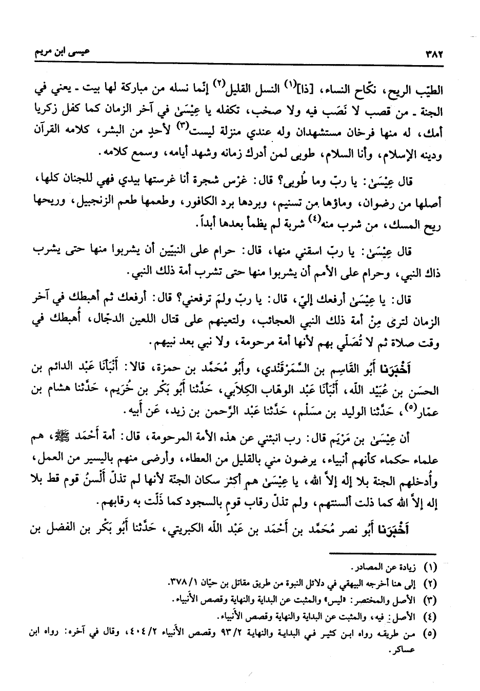 الطيب الريح نكاح النساء ذا النسل القليل انما نسله من مباركة لها بيت يعني في الجنة من قصب لا نصب فيه ولا صخب تكفله يا عيسى في آخر الزمان كما كفل زكريا امك له منها فرخان مستشهدان وله عندي منزلة ليست لاحد من البشر كلامه القرآن ودينه الاسلام وانا السلام طوبى لمن ادرك زمانه وشهد ايامه وسمع كلامه قال عيسى يا رب وما طوبى قال غرس شجرة انا غرستها بيدي فهي للجنان كلها اصلها من رضوان وماؤها من تسنيم وبردها برد الكافور وطعمها طعم الزنجبيل وريحها ريح المسك من شرب منه شربة لم يظمأ بعدها ابدا قال عيسى يا رب اسقني منها قال حرام على النبيين ان يشربوا منها حتى يشرب ذاك النبي وحرام على الامم ان يشربوا منها حتى تشرب امة ذلك النبي قال يا عيسى ارفعك الي قال يا رب ولم ترفعني قال ارفعك ثم اهبطك في آخر الزمان لترى من امة ذلك النبي العجائب ولتعينهم على قتال اللعين الدجال اهبطك في وقت الصلاة ثم لا تصلي بهم لانها امة مرحومة ولا نبي بعد نبيهم اخبرنا أبو القاسم بن السمرقندي وابو محمد بن حمزة قالا انبأنا عبد الدائم بن الحسن بن عبيد الله انبأنا عبد الوهاب الطلابي حدثنا أبو بكر بن خريم حدثنا هشام بن عمار حدثنا الوليد عبد الرحمن بن زيد عن ابيه ان عيسى بن مريم قال رب انبئني عن هذه الامة المرحومة قال امة احمد (صلى الله عليه وسلم) هم علماء حكماء كأنهم انبياء يرضون مني بالقليل من العطاء وارضى منهم باليسير من العمل وادخلهم الجنة بلا اله الا الله يا عيسى هم اكثر سكان الجنة لانها لم تذل السن قوم قط بلا اله الا الله كما ذلت السنتهم ولم تذل رقاب قوم باسجود كما ذلت به رقابهم اخبرنا أبو نصر محمد بن احمد بن عبد الله الكبريتي حدثنا أبو بكر بن الفضل بن