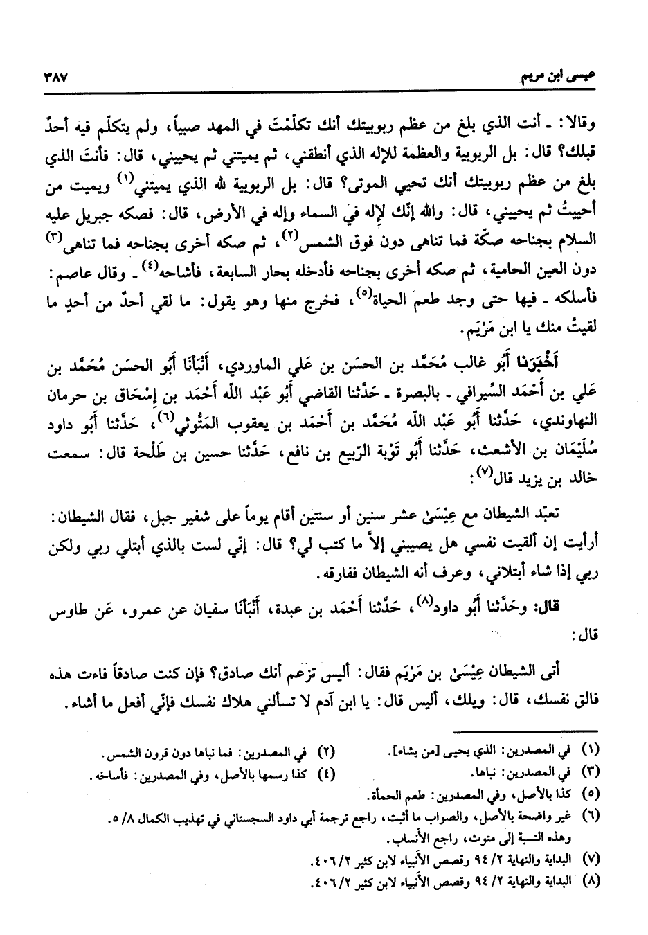 وقالا انت الذي بلغ من عظم ربوبيتك انك تكلمت في المهد صبيا ولم يتكلم فيه احد قبلك قال بل الربوبية والعظمة للاله الذي انطقني ثم يميتني ثم يحييني قال فانت الذي بلغ من عظم ربوبيتك انك تحيي الموتى قال بل الربوبية لله الذي يميتني ويميت من احييت ثم يحييني قال والله انك لاله في السماء واله الارض قال فصكه جبريل عليه السلام بجناحيه صكة فما تناهى دون فوق الشمس ثم صكه اخرى بجناحه فما تناهى دون الين الحامية ثم صكه اخرى بجناحه فادخله بحار السابعة فاشاحه وقال عاصم فاسلكه فيها حتى وجد طعم الحياة فخرج منها وهو يقول ما لقي احد من احد ما لقيت منك يا ابن مريم اخبرنا أبو غالب محمد بن الحسن بن علي الماوردي انبأنا أبو الحسن محمد بن علي بن احمد السيرافي بالبصرة حدثنا القاضي أبو عبد الله احمد بن اسحاق بن حرمان النهاوندي حدثنا أبو عبد الله محمد بن احمد بن يعقوب المتوثي حدثنا أبو داود سليمان بن الاشعث حدثنا أبو توبة الربيع بن نافع حدثنا حسين بن طلحة قال سمعت خالد بن يزيد قال تعبد الشيطان مع عيسى عشر سنين أو سنتين اقام يوما على شفير جبل فقال الشيطان ارأيت ان القيت نفسي هل يصيبني الا ما كتب لي قال اني لست بالذي ابتلي ربي ولكن ربي إذا ساء ابتلاني وعرف انه الشيطان ففارقه قال وحدثنا أبو داود حدثنا احمد بن عبدة انبأنا سفيان عن عمرو عن طاوس قال اتى الشيطان عيسى بن مريم فقال اليس تزعم انك صادق فان كنت صادقا فاءت هذه فالق نفسك قال ويلك اليس قال يا ابن ادم لا تسألني هلاك نفسك فاني افعل ما اشاء
