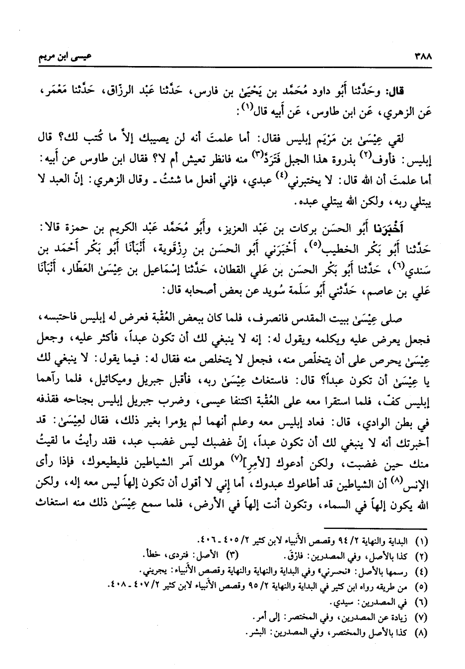 قال وحدثنا أبو داود محمد بن يحيى بن فارس حدثنا عبد الرزاق حدثنا معمر عن الزهري عن ابن طاوس عن ابيه قال لقي عيسى بن مريم ابليس فقال اما علمت انه لن يصيبك الا ما كتب لك قال ابليس فاوف بذروة هذا الجبل فترد منه فانظر تعيش ام لا فقال ابن طاوس عن ابيه اما علمت ان الله قال لا يختبرني عبدي فاني افعل ما شئت وقال الزهري ان العبد لا يبتلي ربه ولكن الله يبتلي عبد هـ أخبرنا أبو الحسن بركات بن عبد العزيز وابو محمد عبد الكريم بن حمزة قالا حدثنا أبو بكر الخطيب اخبرني أبو الحسن بن رزقوية انبأنا أبو بكر احمد بن سندي حدثنا أبو بكر الحسن بن علي القطان حدثنا اسماعيل بن عيسى العطار انبأنا علي بن عاصم حدثني أبو سلمة سويد عن بعض اصحابه قال صلى عيسى ببيت المقدس فلما كان ببعض العقبة فعرض له ابليس فاحتبسه فجعل يعرض عليه ويكلمه ويقول له انه لا ينبغي لك ان تكون عبدا فاكثر عليه وجعل عيسى يحرص على ان يتخلص منه فجعل لا يتخلص منه فقال له فيما يقول لا ينبغي لك يا عيسى ان تكون عبدا قال فاستغاث عيسى ربه فاقبل جبريل وميكائيل فلما رآهما ابليس كف فلما استقرا ممعه عل العقبة اكتنفا عيسى وضرب جبريل ابليس بجناحه فقذفه في بطن الوادي قال فعاد ابليس معه وعلم انهما لم يؤمرا بغير ذلك فقال لعيسى قد اخبرتك انه لا ينبغي لك ان تكون عبدا ان غضبك ليس غضب عبد فقد رأيت ما لقيت منك حين غضبت ولكن ادعوك لامر هو لك أمر الشياطين فليطيعوك فإذا رأى الانس ان الشياطين قد اطاعوك عبدوك اما اني لا اقول ان تكون الها ليس معه اله ولكن الله يكون الها في السماء وتكون انت الها في الارض فلما سمع عيسى ذلك منه استغاث
